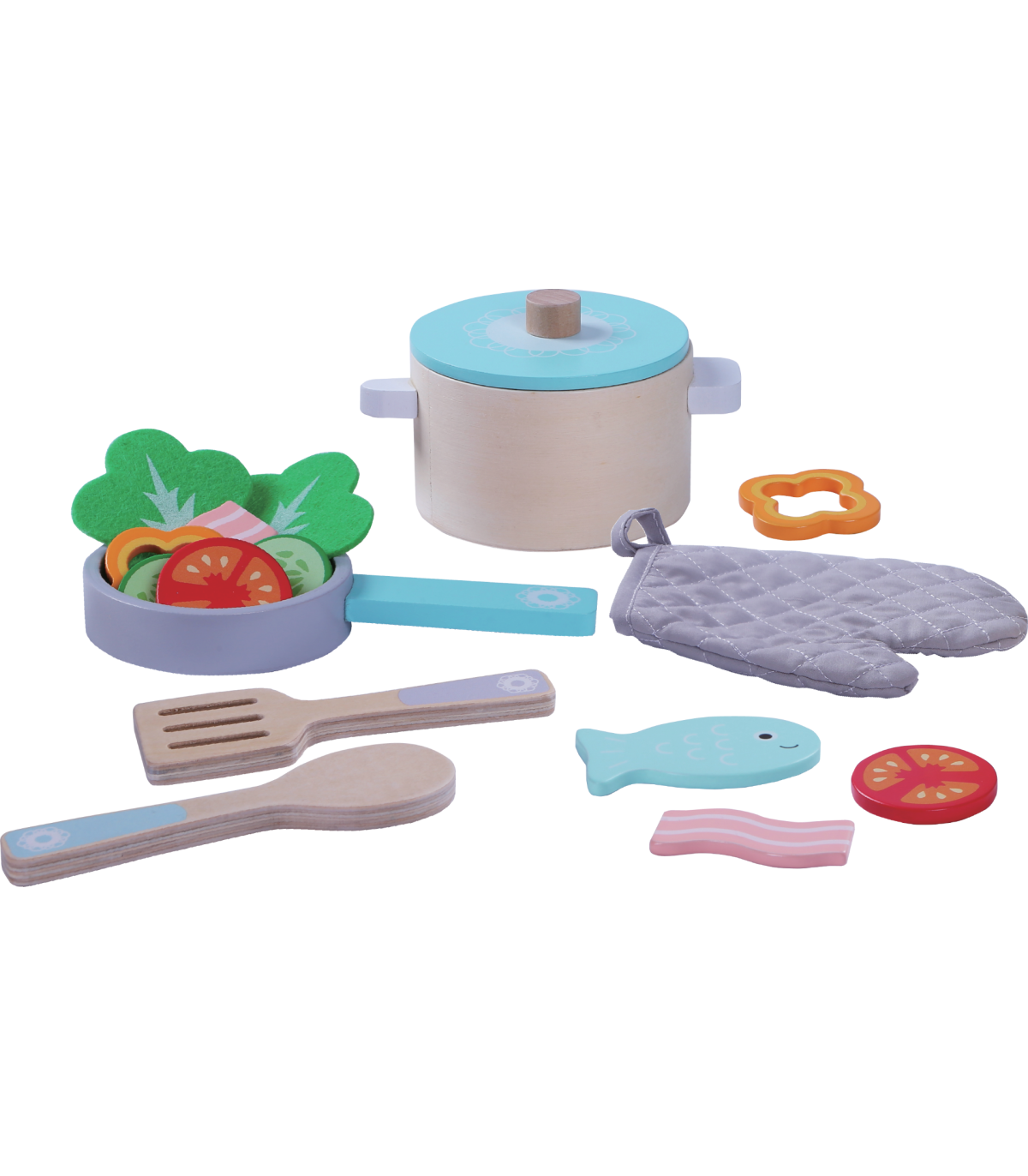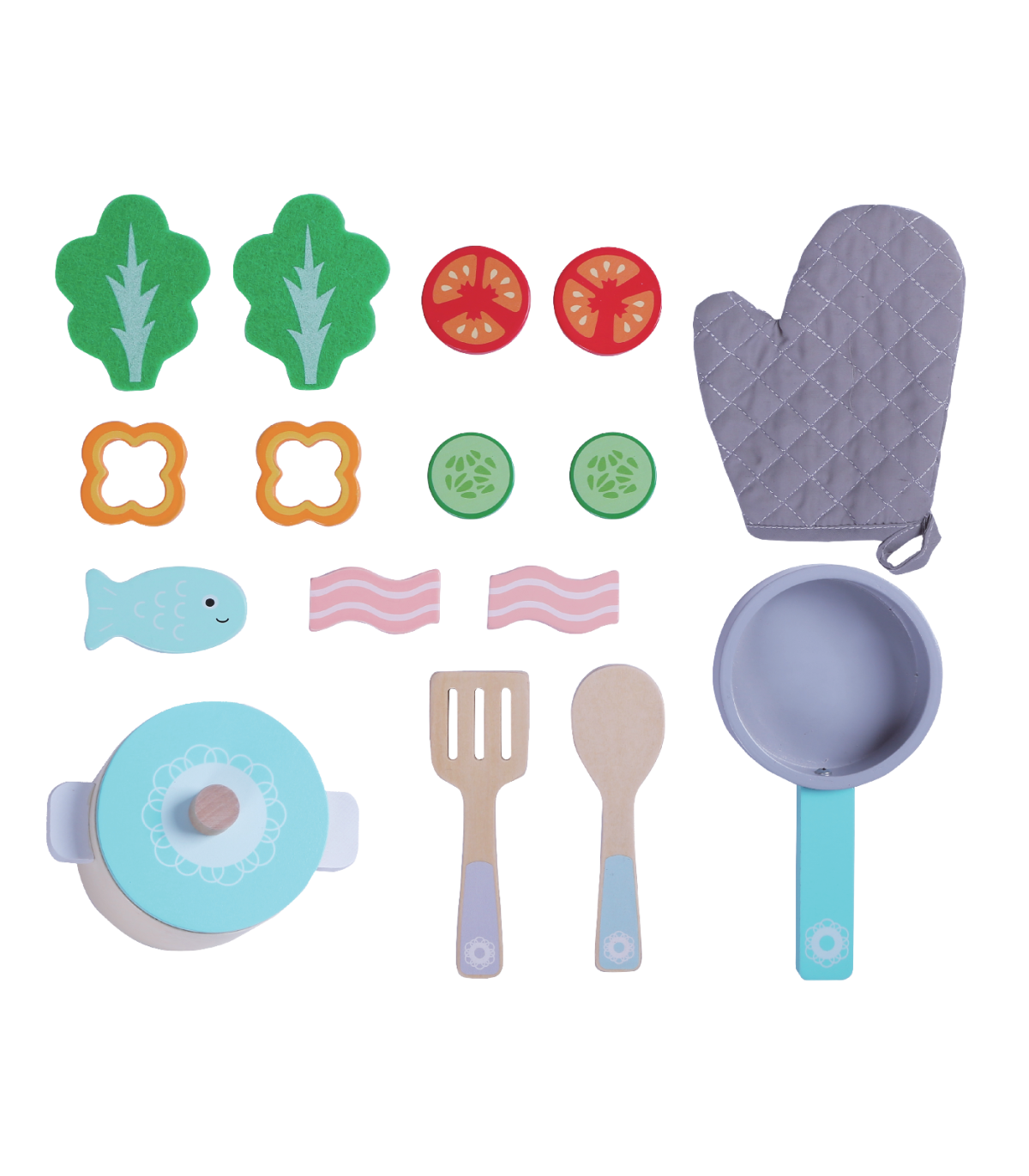 Komplektis on kokku 16 osa, mille hulgas pott, pann ning erinevad vahendid söögi valmistamiseks.