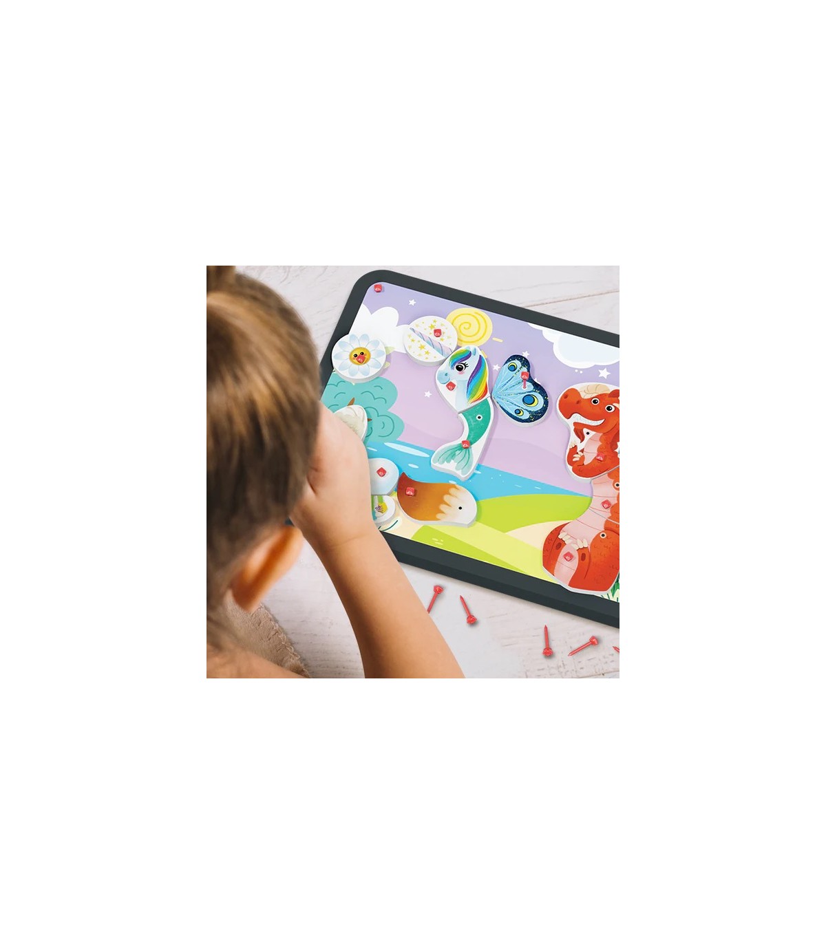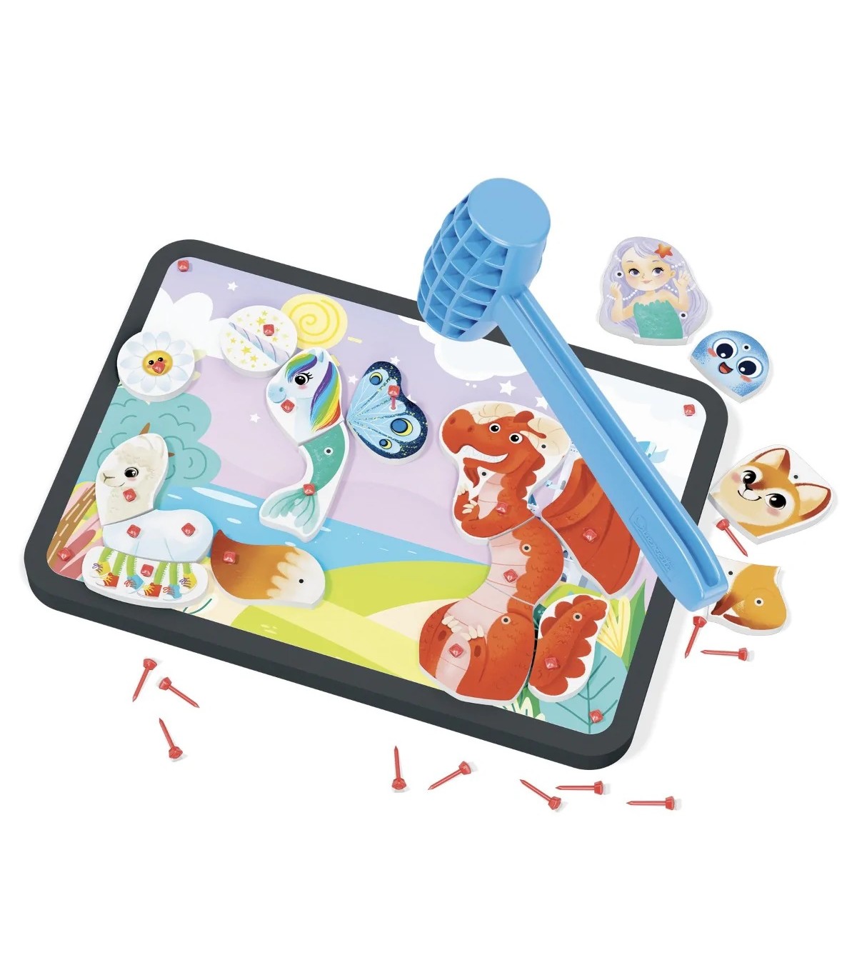 Komplektis on alus, haamer ning erinevad tükid, millest pilte kokku panna.