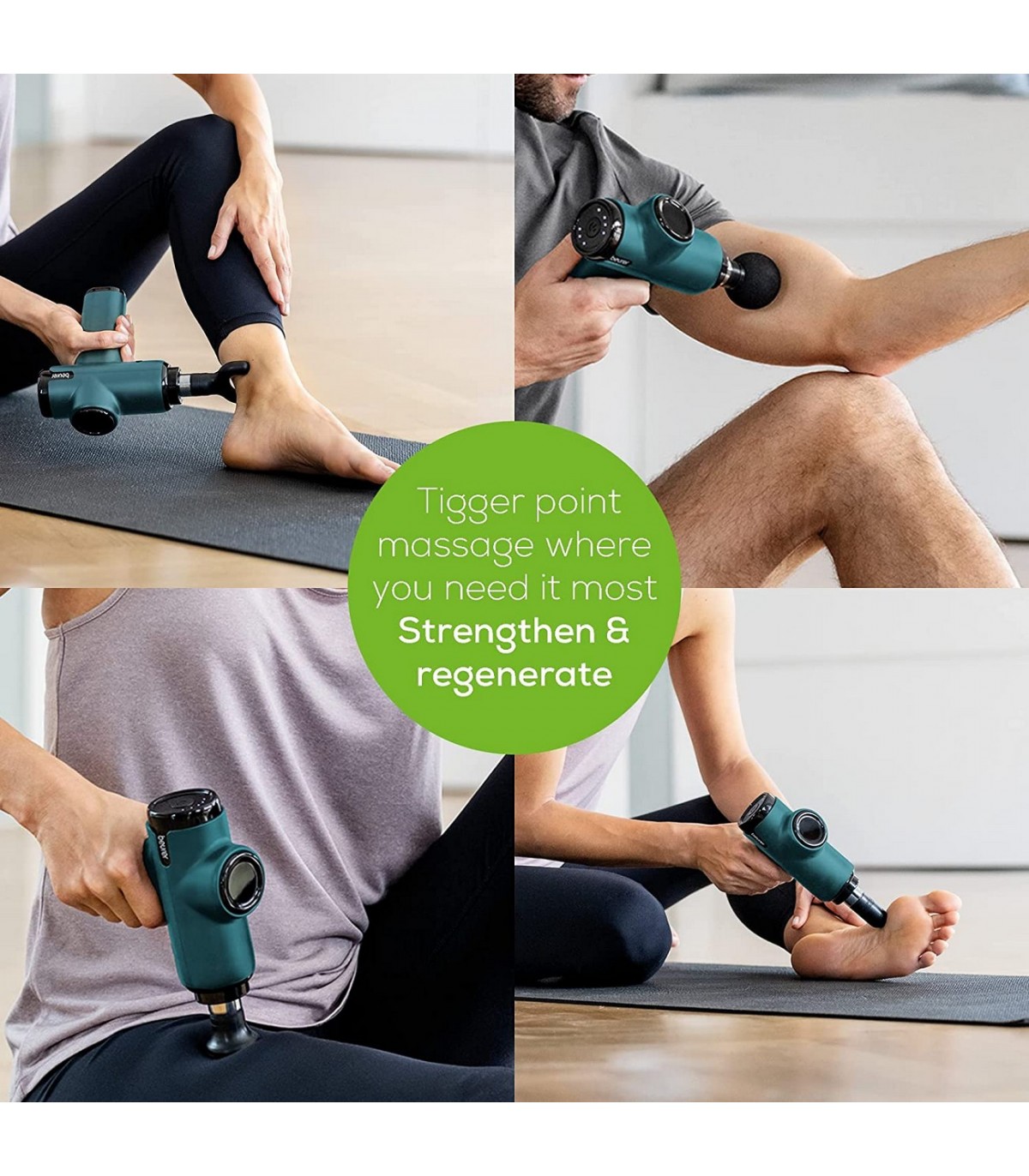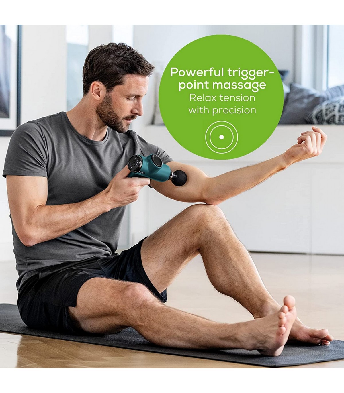 * Massaažipüstoliga saab sihipäraselt leevendada pinges lihaseid. Massaažipüstol avaldab muljet oma kerguse ja ergonoomilise kujuga mugavaks raviks, värv roheline