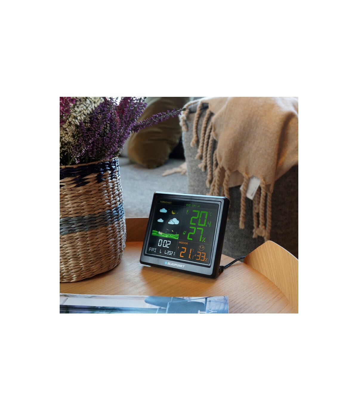 * Graafiline piktogrammidega ilmaennustus, temperatuuri ja niiskuse trendi näitamine, õhurõhu näit