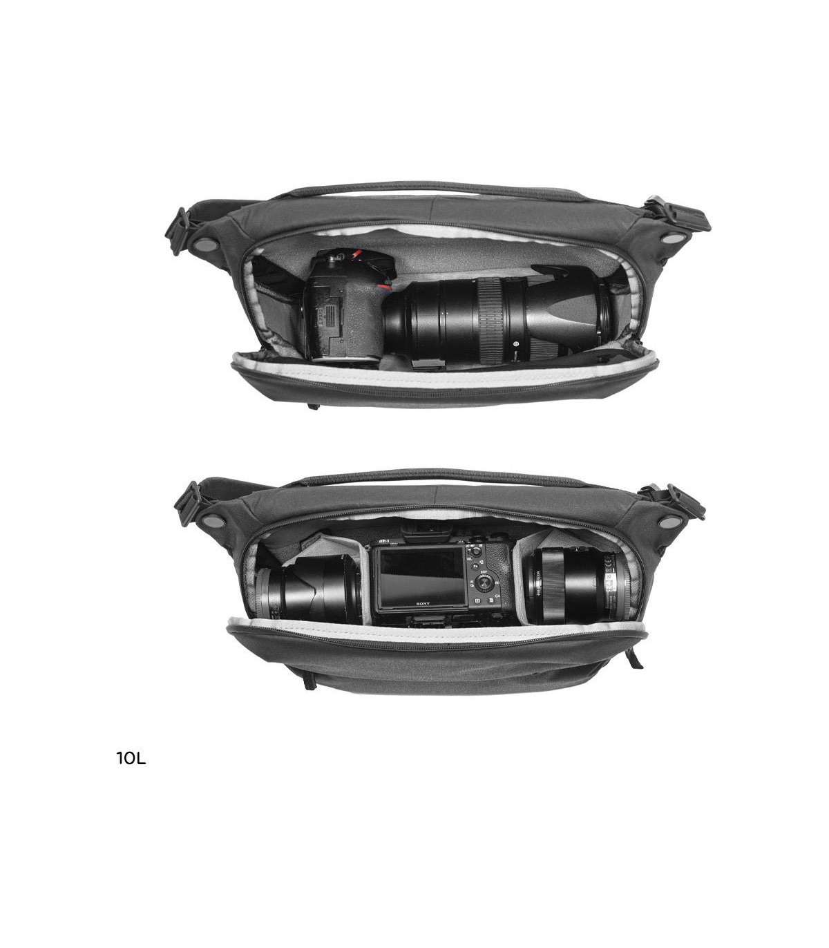 Vali oma suurus: 3L kott on mõeldud ühe väikese hübriidkaamera või objektiivi jaoks. 6L mahutab suurema kaamera. 10L mahutab väikese komplekti ja on täiuslik minimalistlik 13-tolline sülearvutikott.