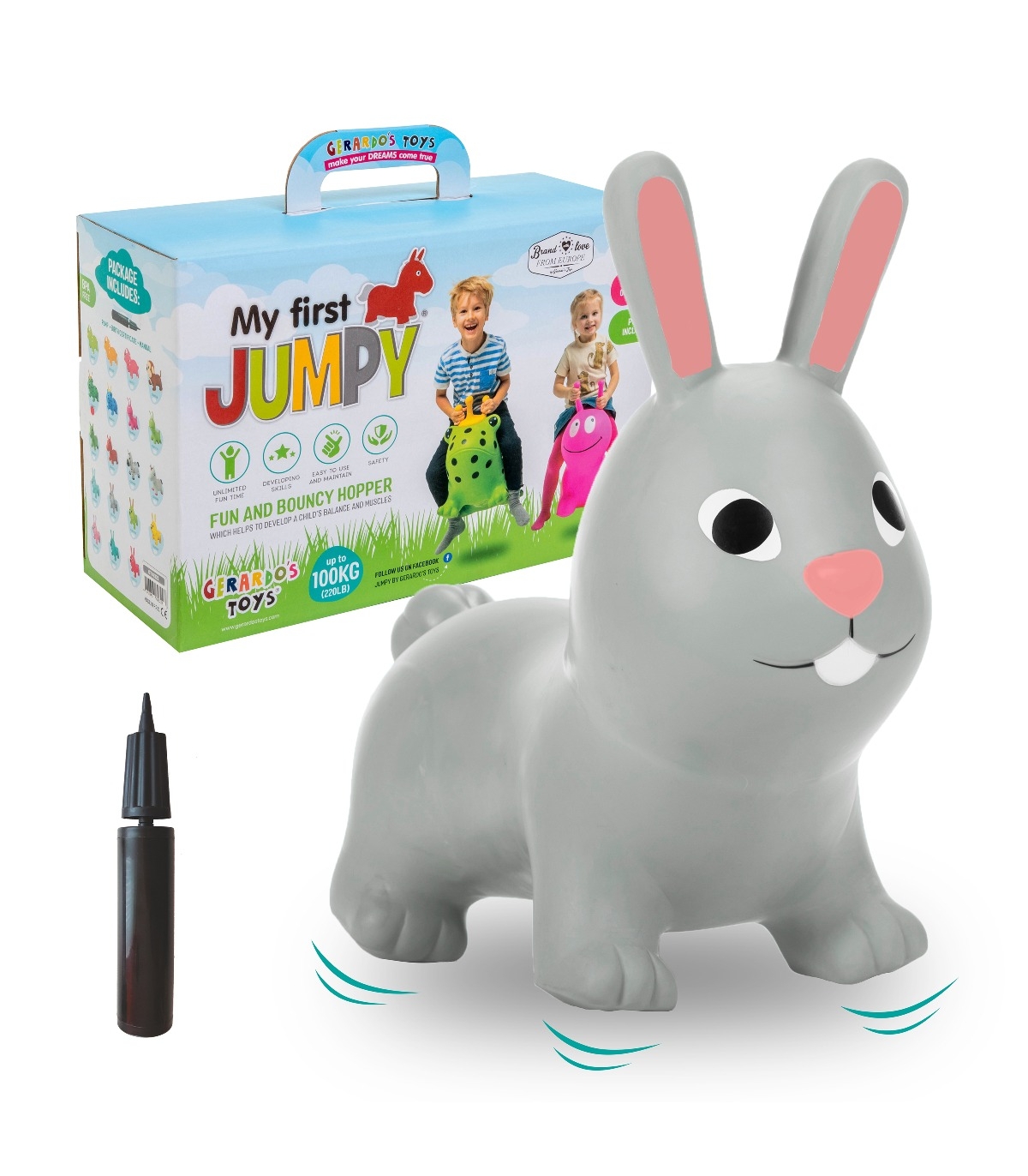 Komplektis on Jumpy hüppeloom, sünnitunnistus ning käsipump, millega saab looma kiirelt ja lihtsalt täis pumbata.