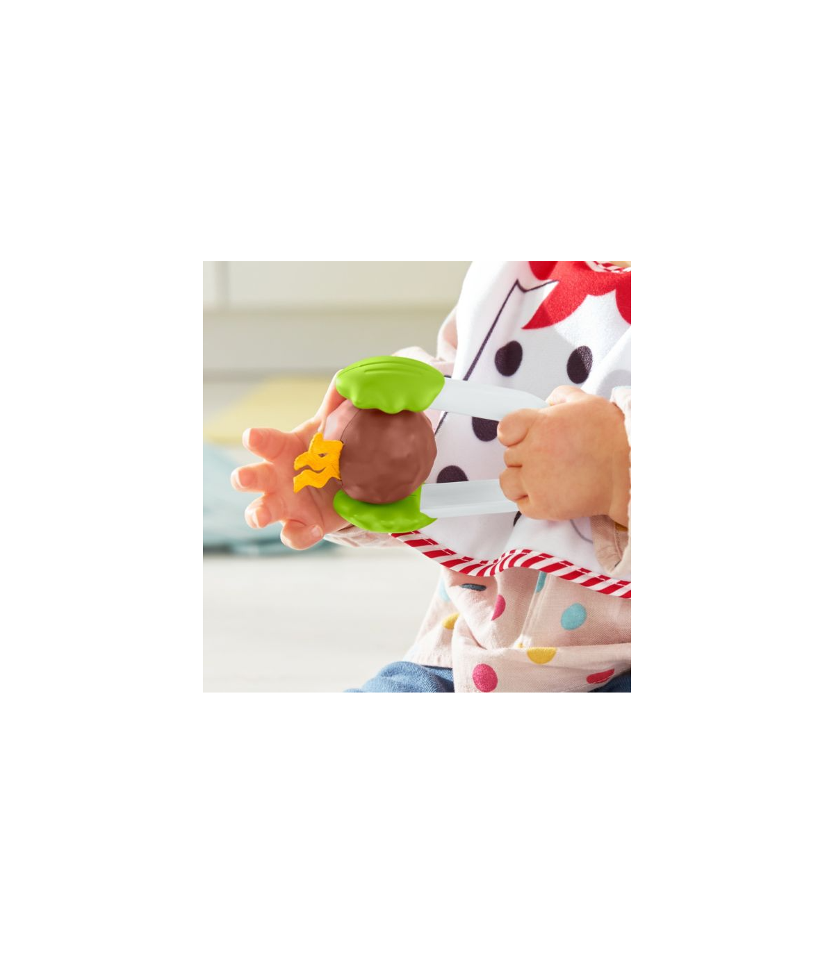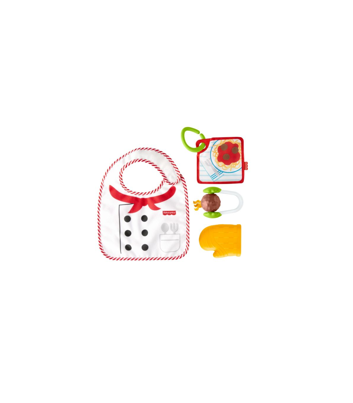 See 4-osaline toiduvalmistamise teemaline imikute mänguasjade komplekt sisaldab riputatavat toidukaarti, pajakinnast, põlle ning lihapalliga toidutange.