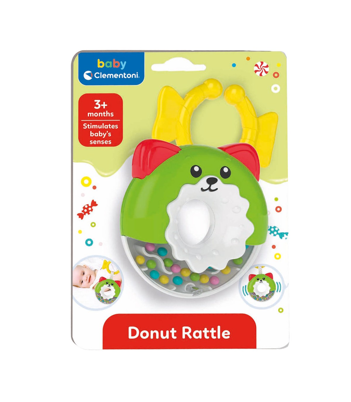 Clementoni sõõrikukujuline kõristi tekstuursete närimispallikeste ja käepärase rõngaga võrevoodi või käru külge riputamiseks.
