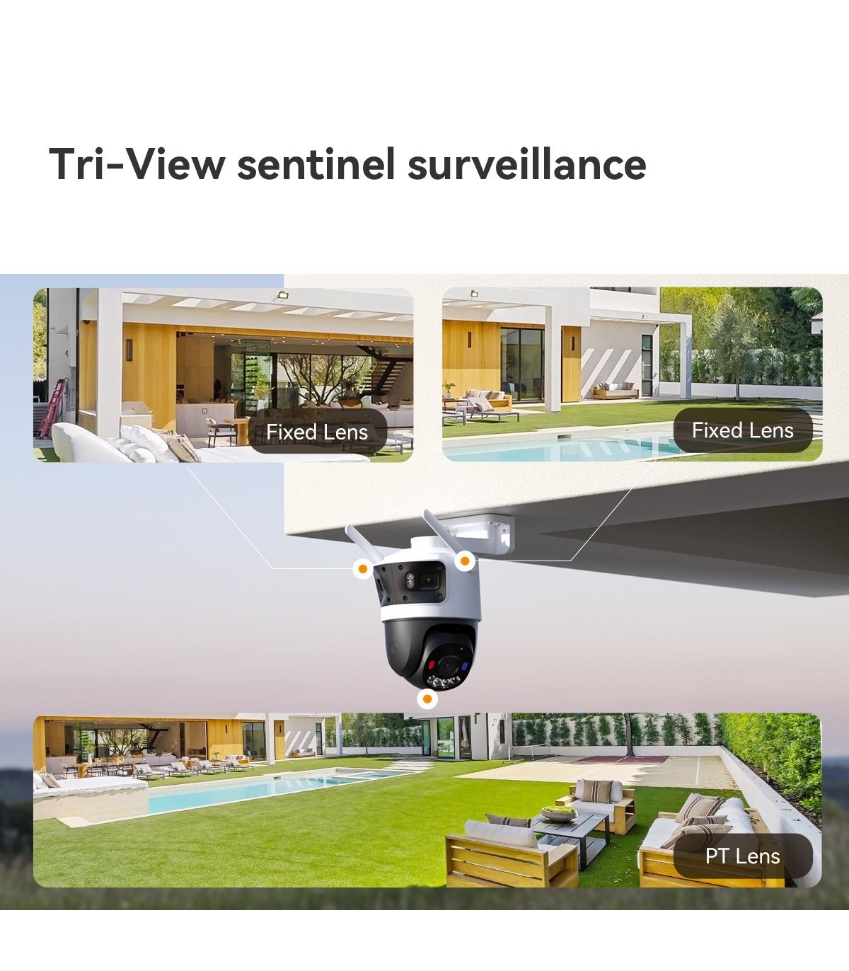 - Imou Cruiser Triple. Type: IP security camera, Placement supported: Outdoor, Connectivity technology: Wired & Wireless. Mounting type: Ceiling/wall, Product colour: Black, White, Form factor: Turret. Lens viewing angle, horizontal: 51°, Lens viewing angl