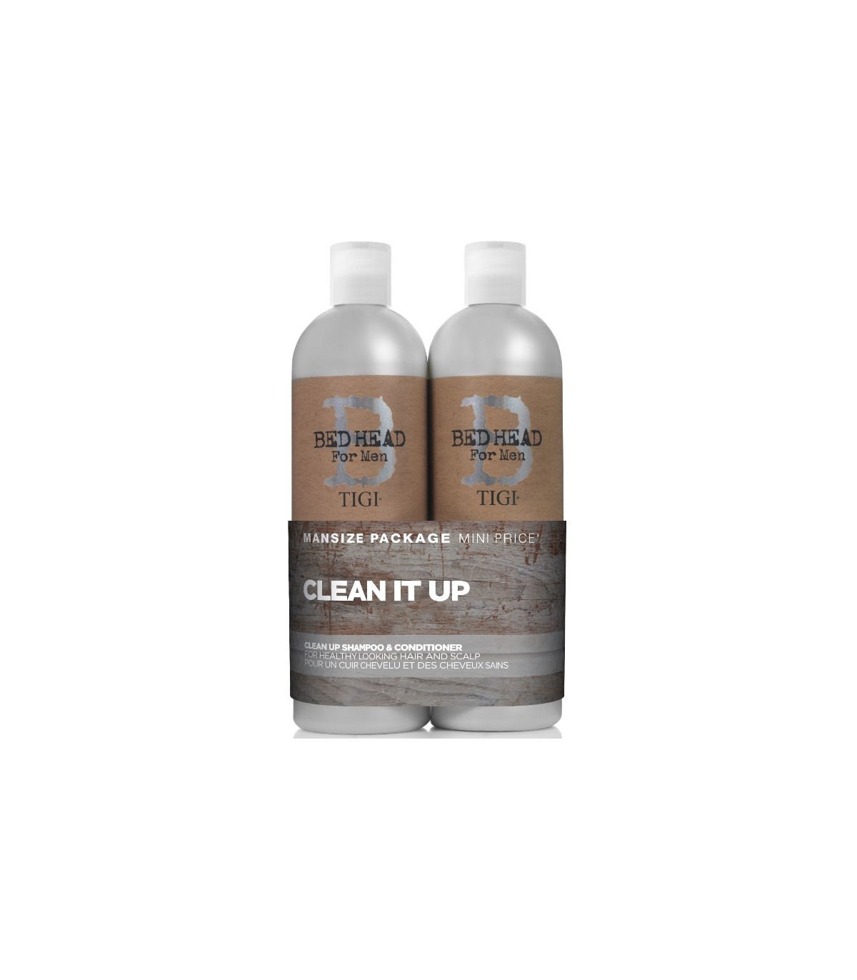 Tigi Bed Head For Men Clean Up Duo komplektis šampoon (750mL) ja palsam (750mL). Šampoon igapäevaseks kasutamiseks, puhastab juuksed põhjalikult stimuleerides ja ergutades peanahka. Šampoon pakatab energiast ja värskusest! Kasutamine: lisada niisketele juustele, masseerida peanaha ligi ja loputada. Pärast pesu kasutada Bed Head for Men Clean Up Peppermint Conditioneri. Palsam meestele, kes soovivad terveid juukseid ja peanahka. Igapäevaseks kasutamiseks, niisutab, tugevdab juukseid ja stimuleerib peanahka andes värske tunde. Kasutamine: kanna väike kogus palsamit pestud rätikukuivadesse juustesse ning hoia 1 minut, seejärel loputa.