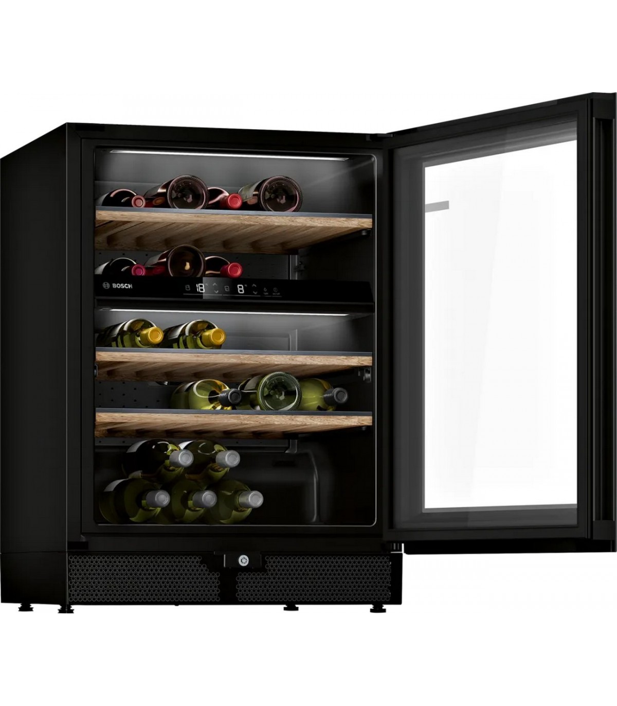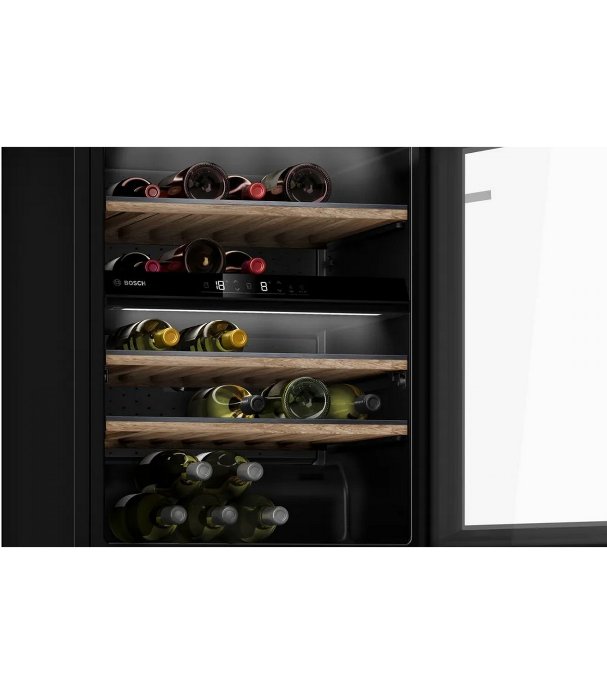 - 2 temperatuuritsooni – saate hoida oma punaseid ja valgeid veine ühes kohas temperatuuril 5–20 °C. Teleskoopsiinidel tammepuidust riiulid, ukselukk