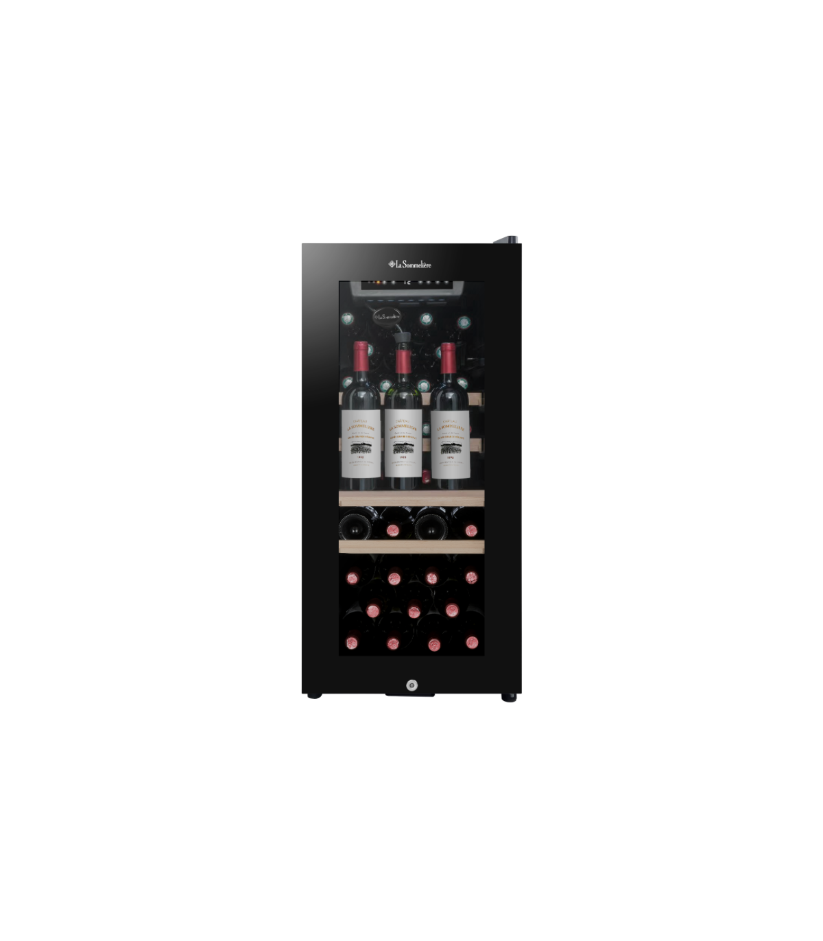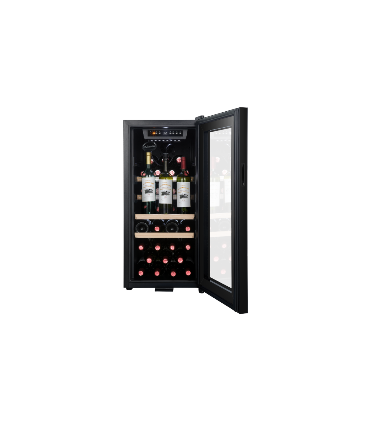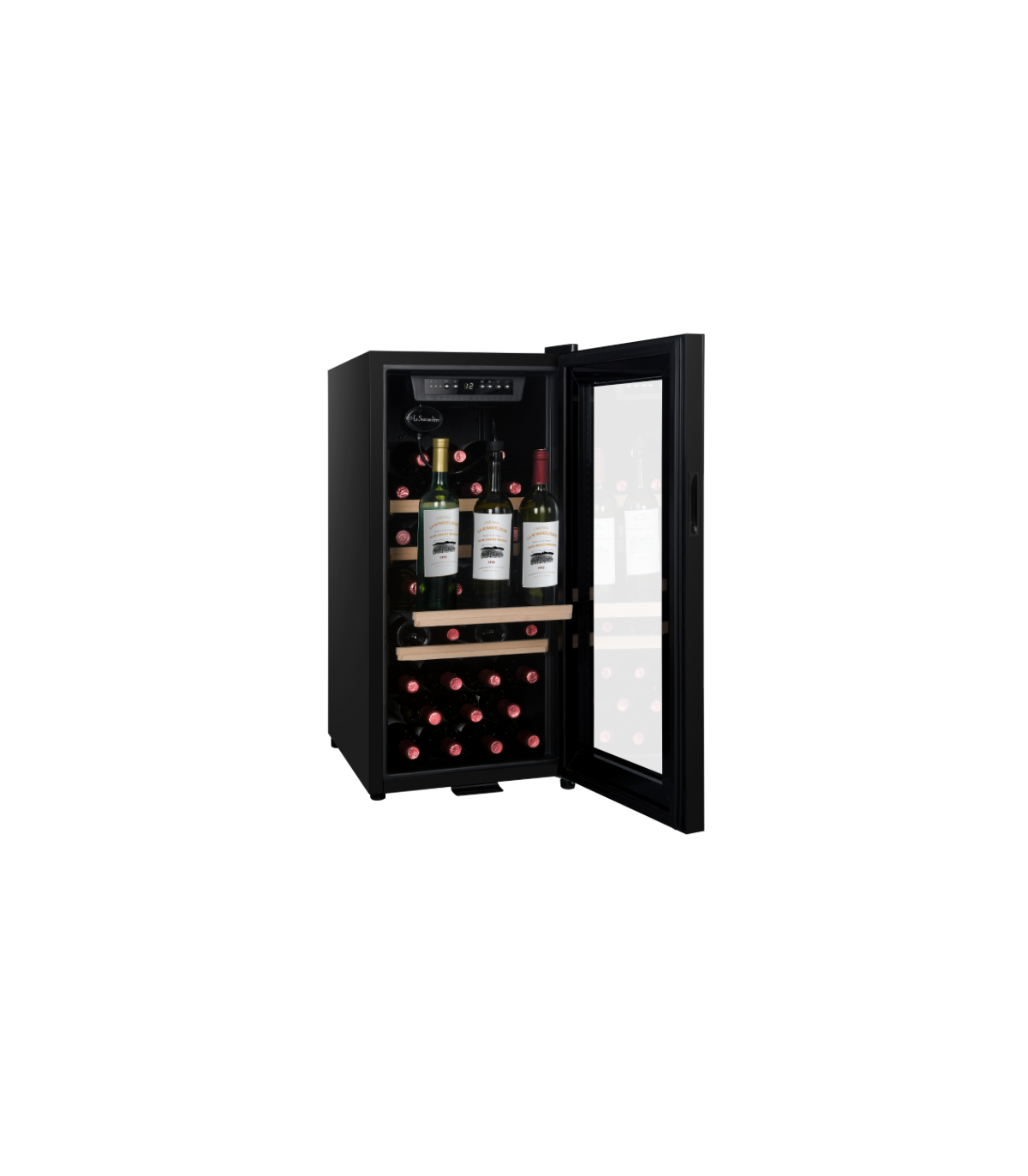 In this single-zone cellar, you can set the temperature between 5°C and 20°C. The stylish cellar is supplied with 2 wood-fronted metal wire shelves, as well as 2 half-shelves. These half-shelves, inserted at the rear of the cellar, allow 3 bottles to be stored upright, in front of them.