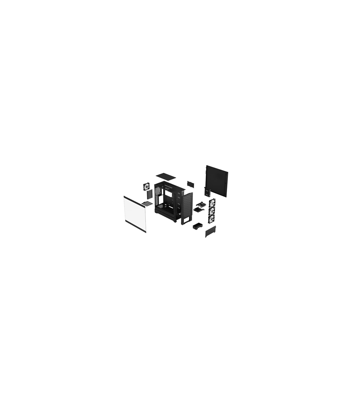 - Top (perforated plastic), PSU (nylon), Front (perforated steel)