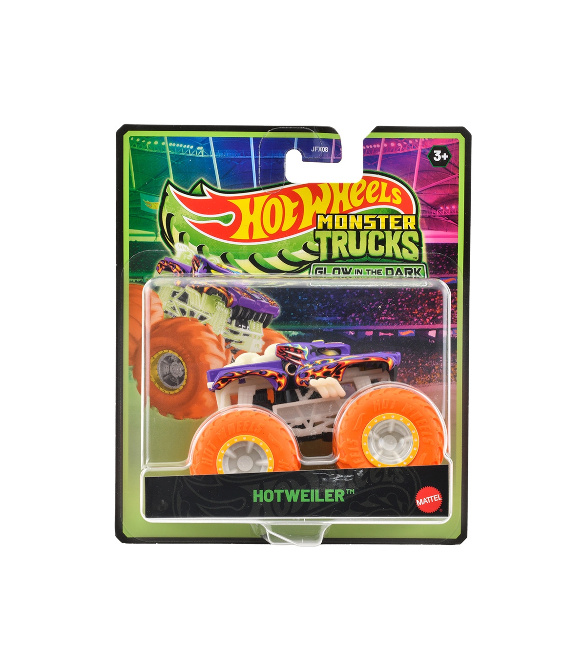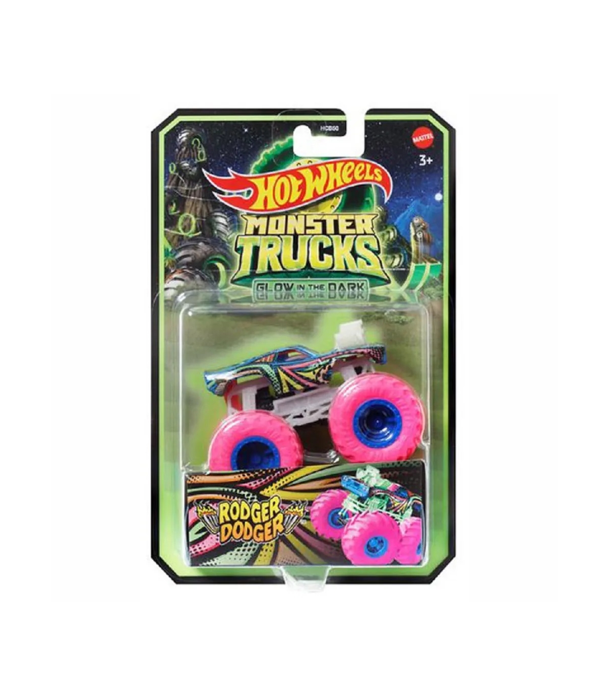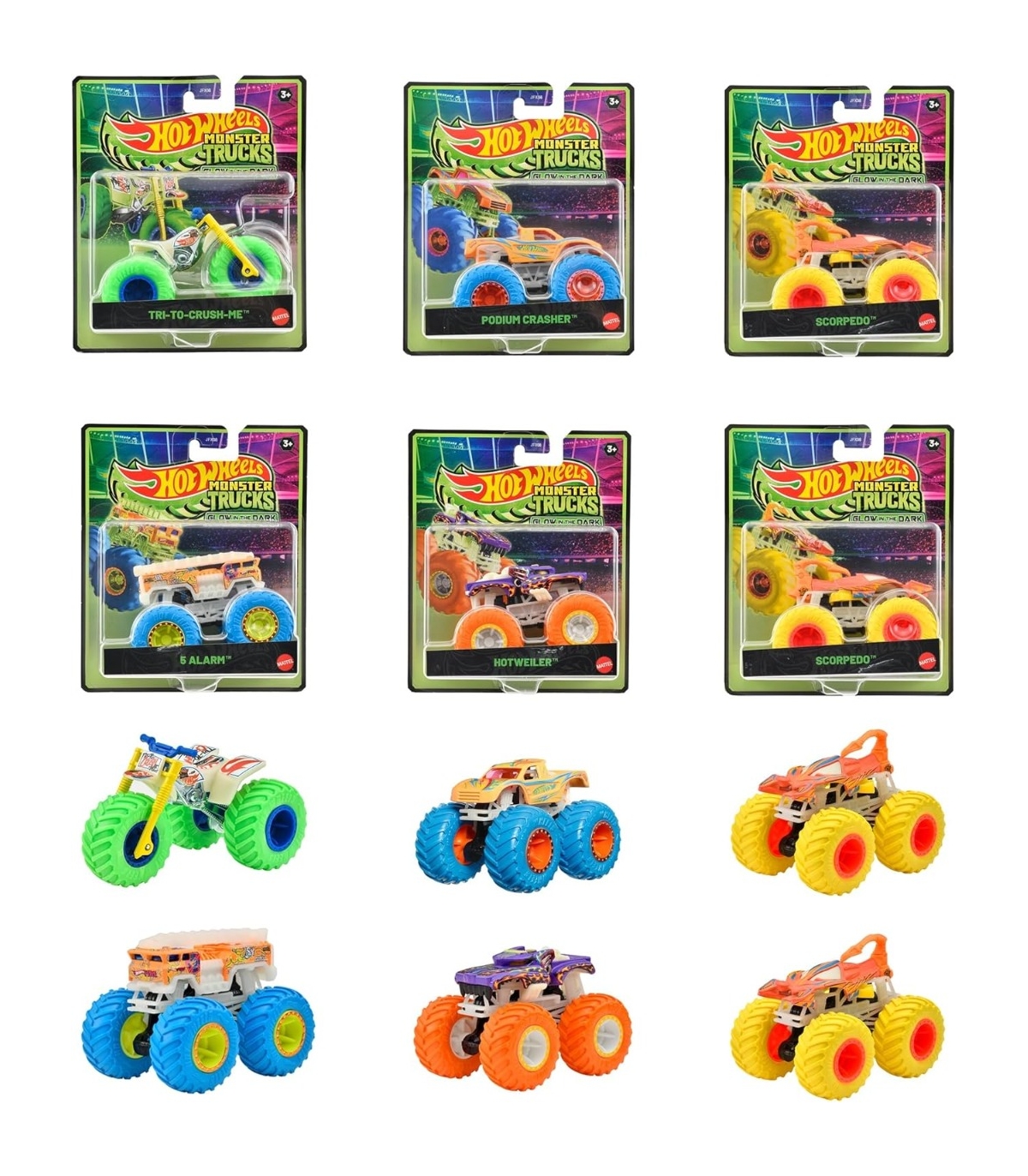 Hot Wheels Monster Trucks Glow-in-the-Dark pimedas helendavad mänguautod.