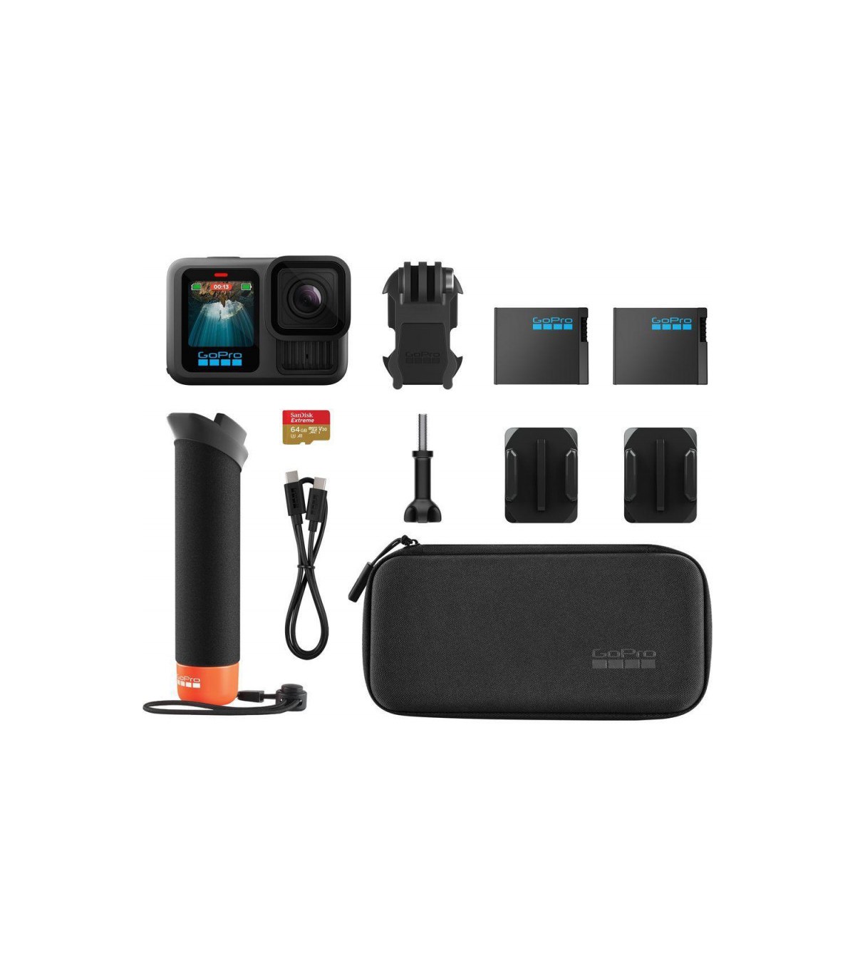 *Komplektis Hero13 Black, Handler käepide, 2xEnduro aku, 2x kumer kleebitav kinnitus, Sandisk 64GB mälukaart, GoPro kandekott!