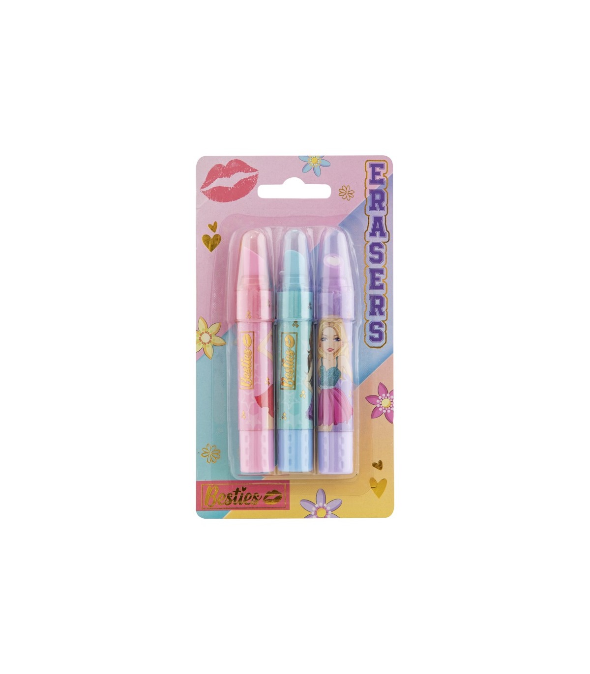 Komplekti kuulub kolm huulepulgakujulist kustutuskummi: roosa, lilla ja helesinine.