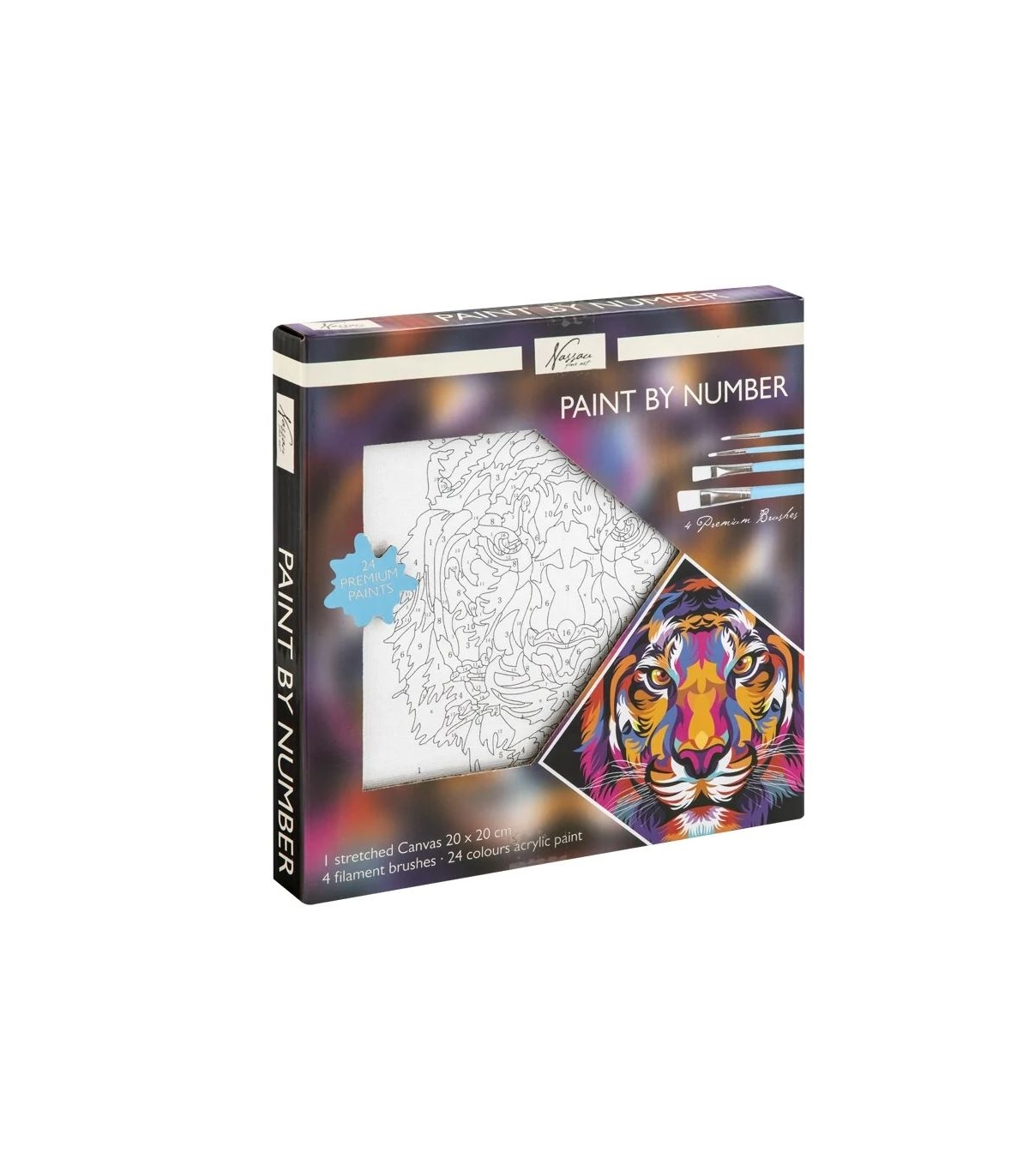 Mõnus komplekt, milles on pilt, 4 pintslit ning 24 akrüülvärvi.
