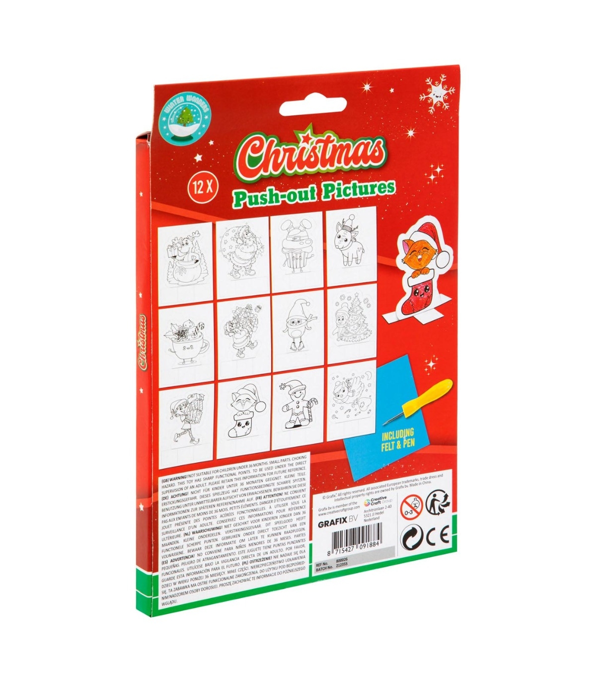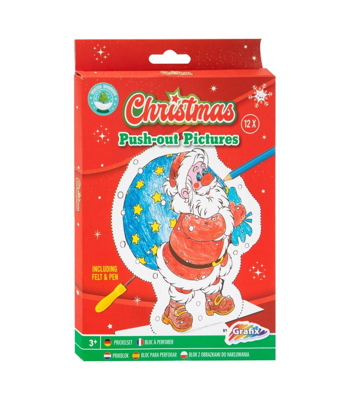 Komplekti kuulub 12 lehte, vildist alus piltide välja vajutamiseks ja spetsiaalne torkepliiats.