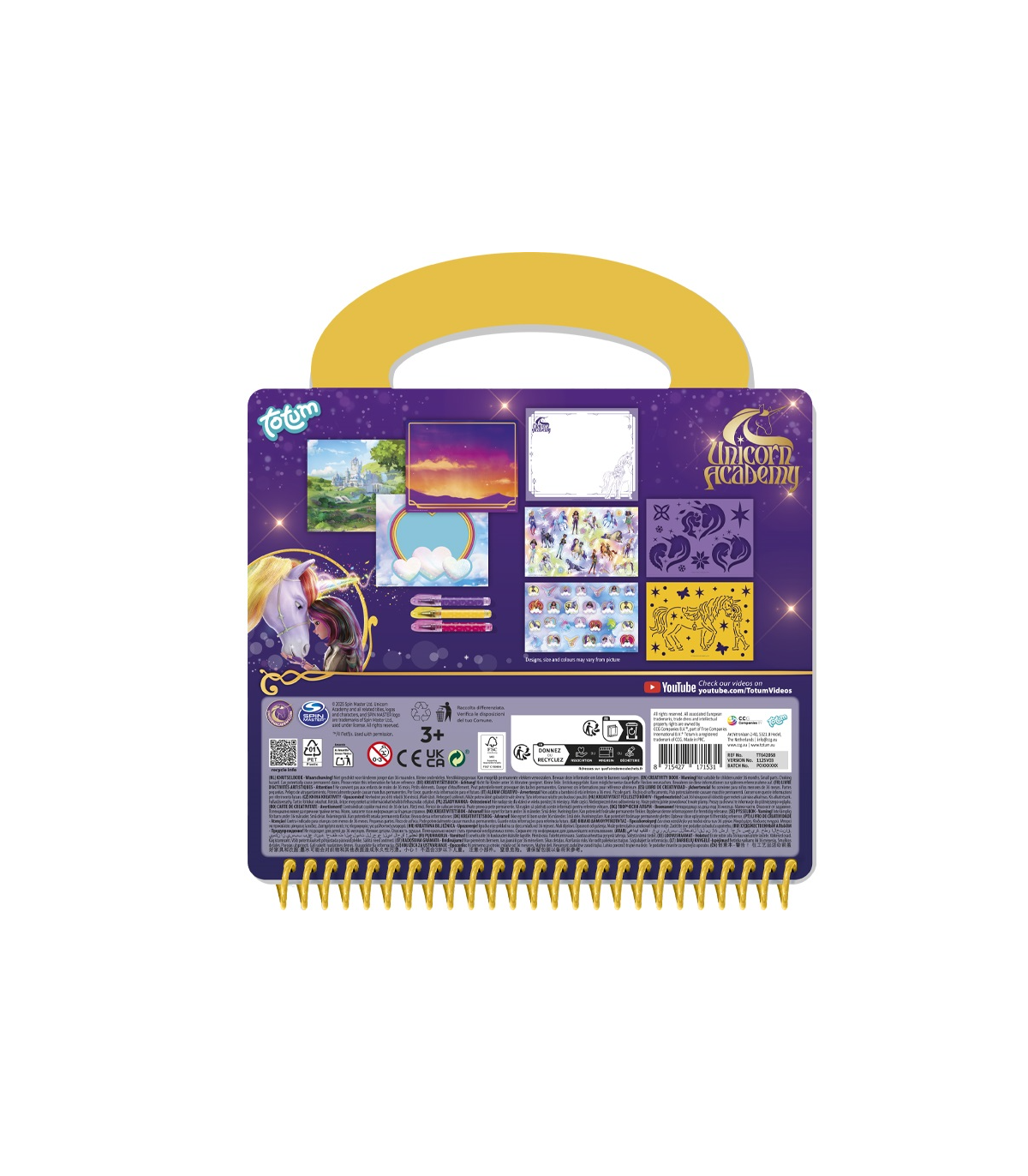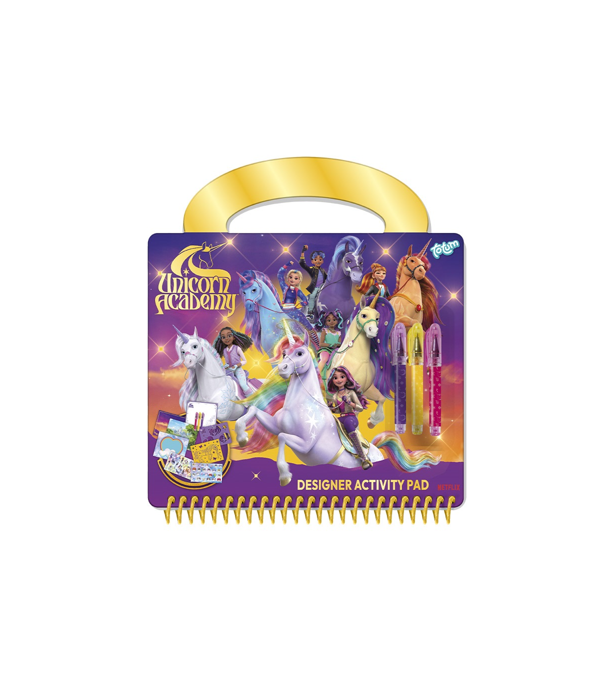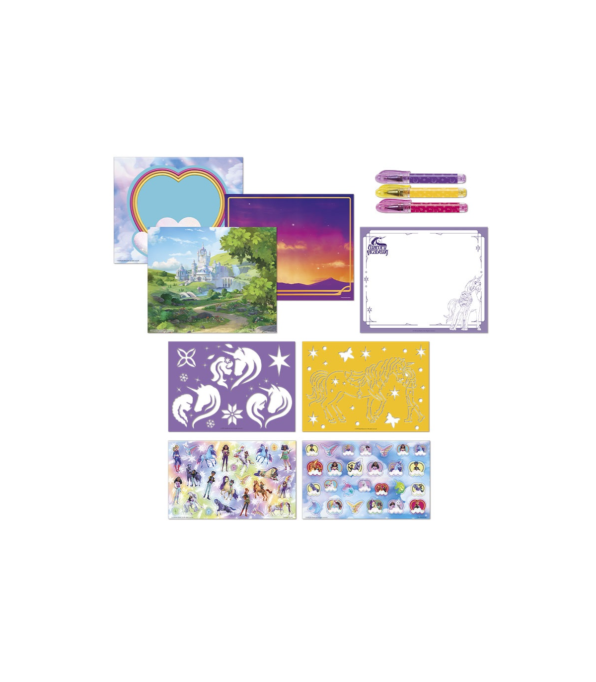 Komplekt sisaldab tegevusraamatut, erinevaid loomingulisi ülesandeid ning värvilisi geelpliiatseid, millega saab joonistada, värvida ja kaunistada oma lemmiktegelasi Unicorn Academy maailmast. Spiraalköide võimaldab lehti mugavalt keerata ning tugev käepide teeb komplekti kandmise lihtsaks.