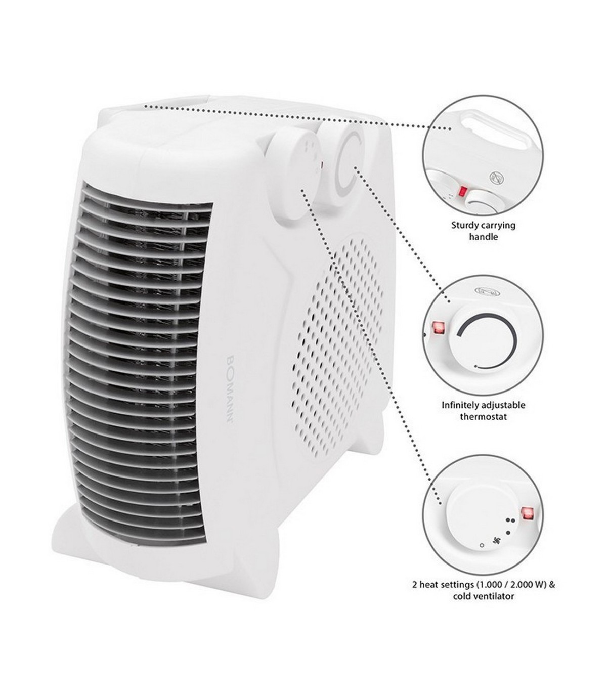 * 2 soojendamise võimsusastet: 1000 W ja 2000 W, külma õhu funktsioon (ventilaator)