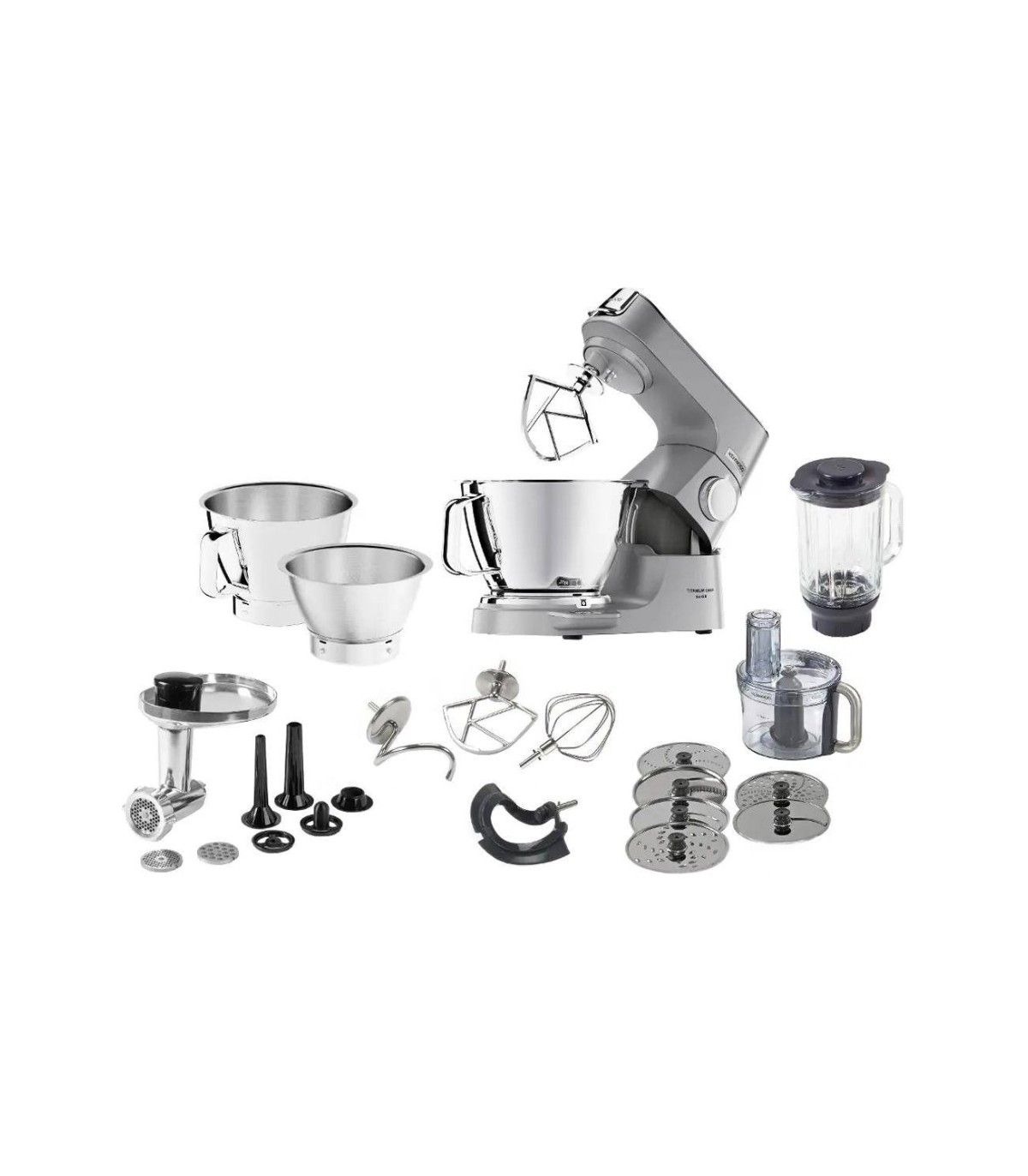 - Roostevaba käepidemetegaanuma maht 5l, kaanega 3,5l roostevabaterastest kauss,4 otsikut (K- otsik, vispel, taignakonks, segamislaba) viilutamiseks ja riivimiseks 6 riivketast+1 purustusnuga,Thermo Resist blender (1,6 l) klaasakann, hakklihamasin 3 teraga