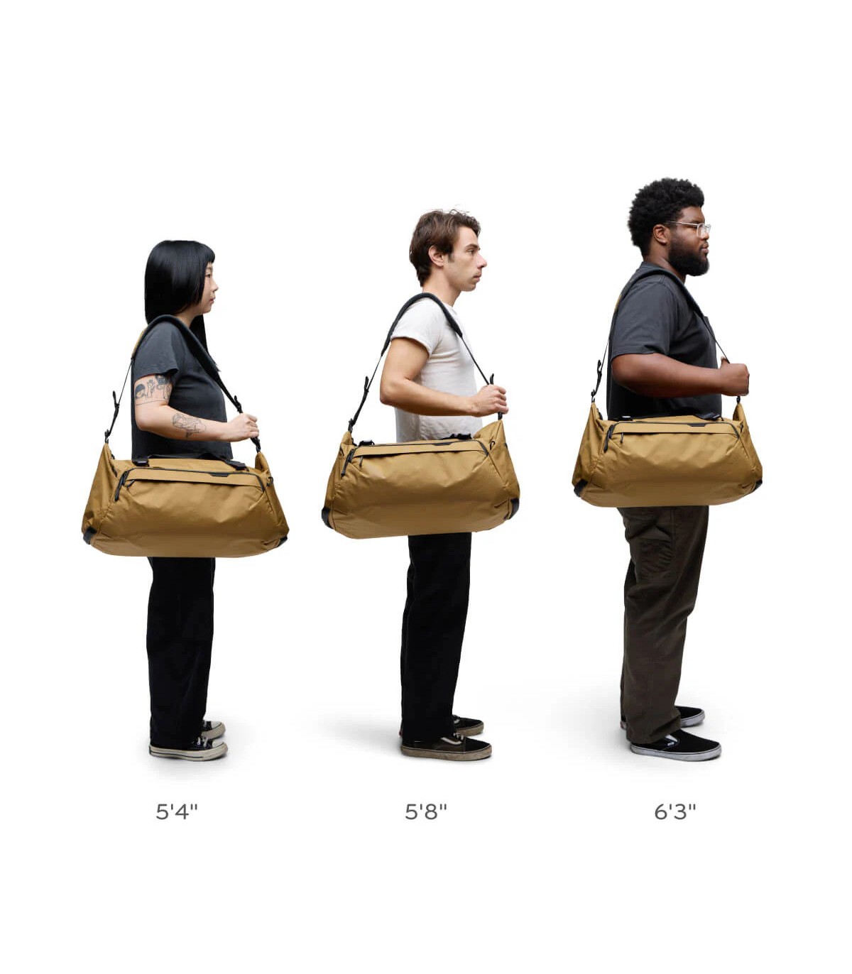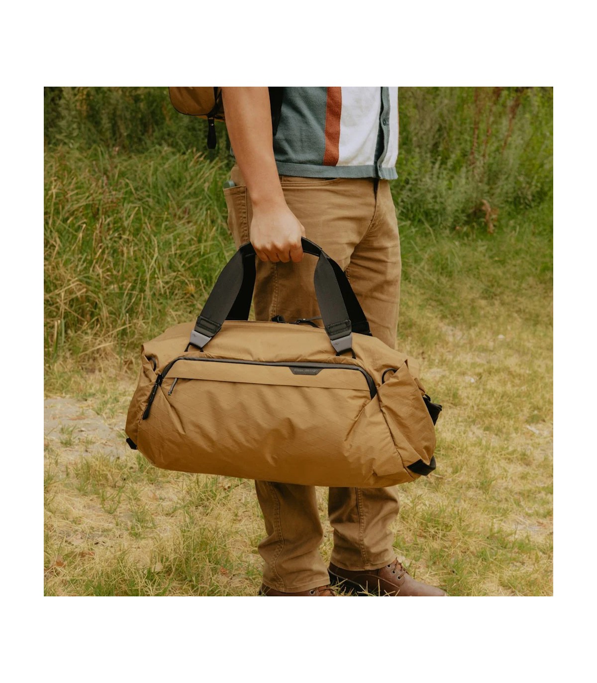 Travel Duffel on väga mitmekülgne oma paindlike kandmisviiside poolest. Esiteks saad maksimaalse mugavuse tagamiseks seda kanda kahe õlarihmaga seljas. Teiseks, saad seda kanda sling-tüüpi kotina kasutades vaid üht õlarihma. Kolmandaks on võimalik seda kanda duffel-tüüpi kotina õlal, et pääseda tervele koti sisule mugavalt ligi. Lisaks on võimalik seda sanga abil käes kanda.