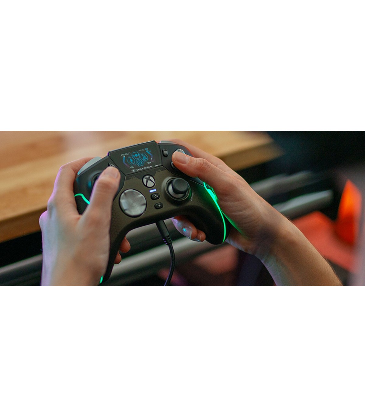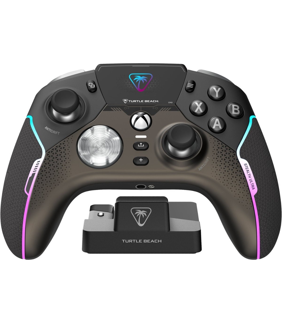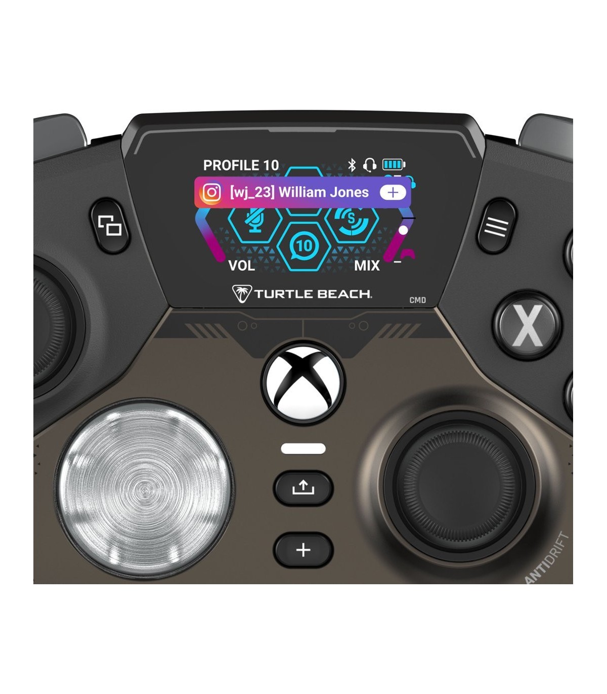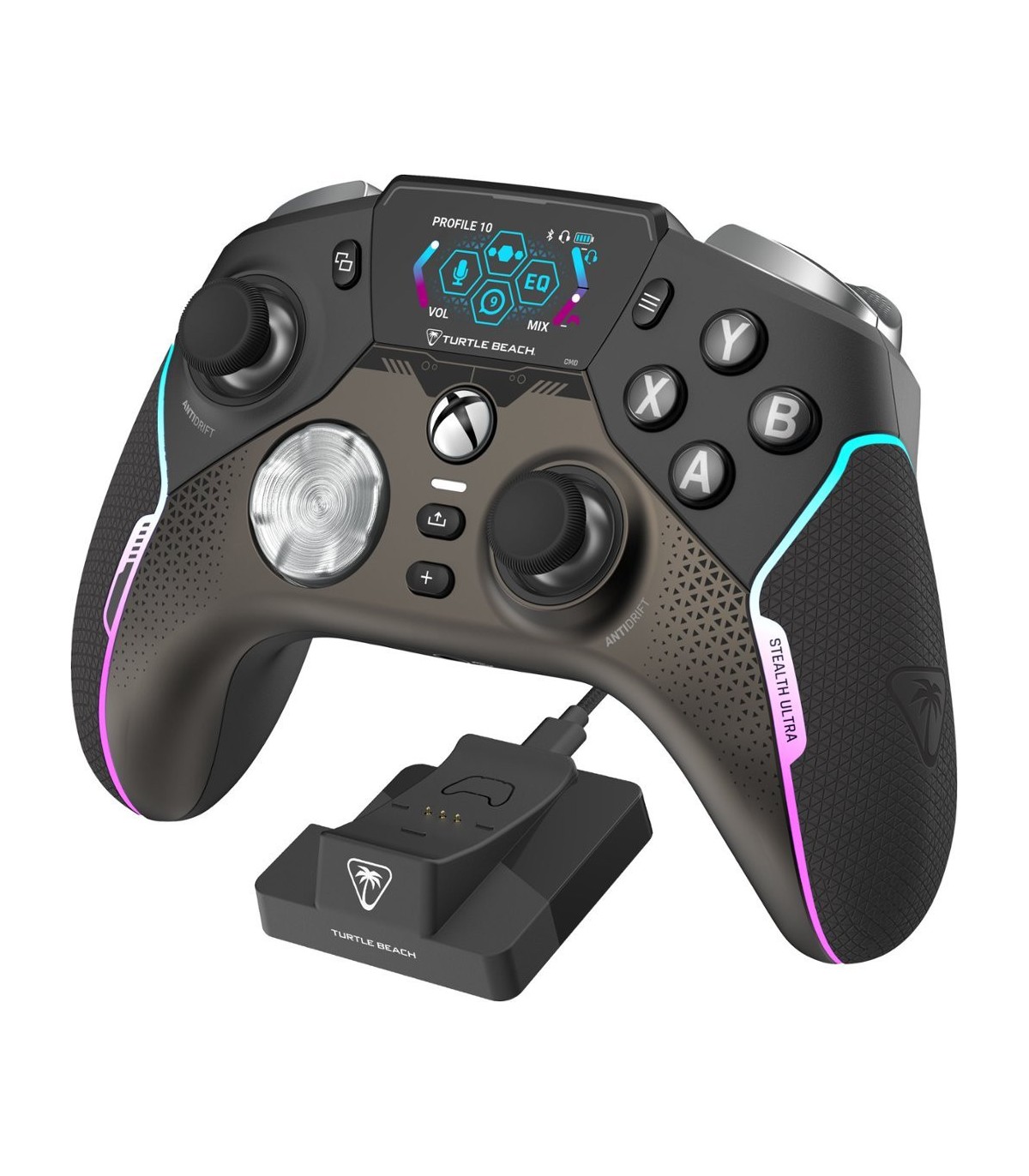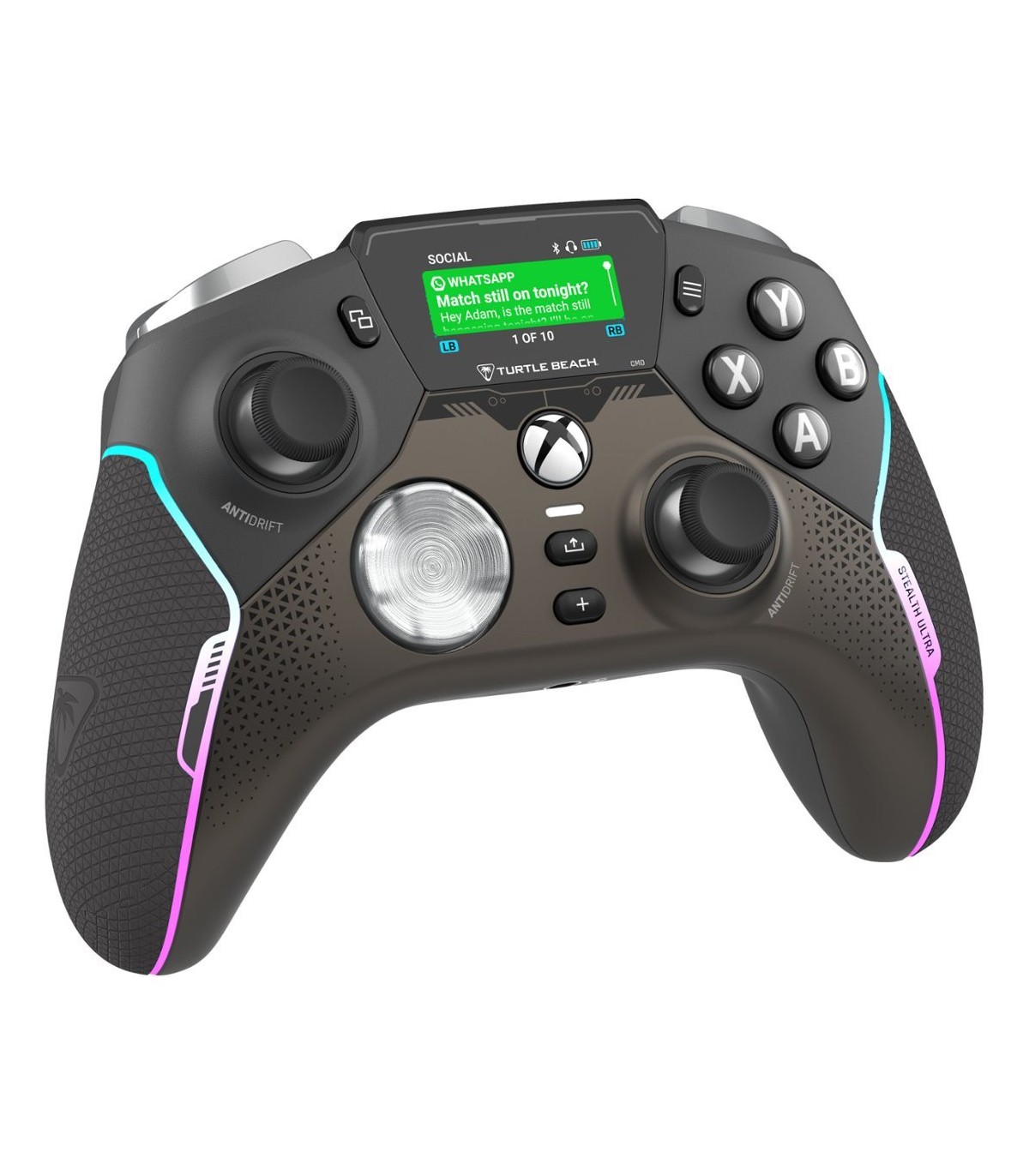 Erinevalt kõigest, mida mängudes varem nähtud, hoiab Turtle Beach'i dünaamiline täisvärviline Command Display ekraan Sind ühenduses sotsiaalmeedia märguannetega ja võimaldab kohandada mängupuldi seadistusi. Vabasta Stealth™ Ultra kogu potentsiaal ja salvesta kuni 10 profiili nuppude kaardistamise, surnud tsoonide ja telje reageerimisrežiimide, vibratsiooni intensiivsuse, helitäiustuste ja RGB-valgustuse kohandamisega.