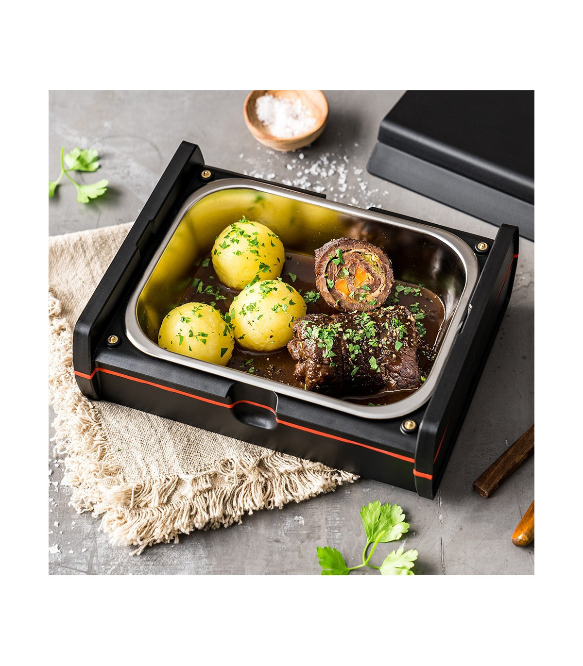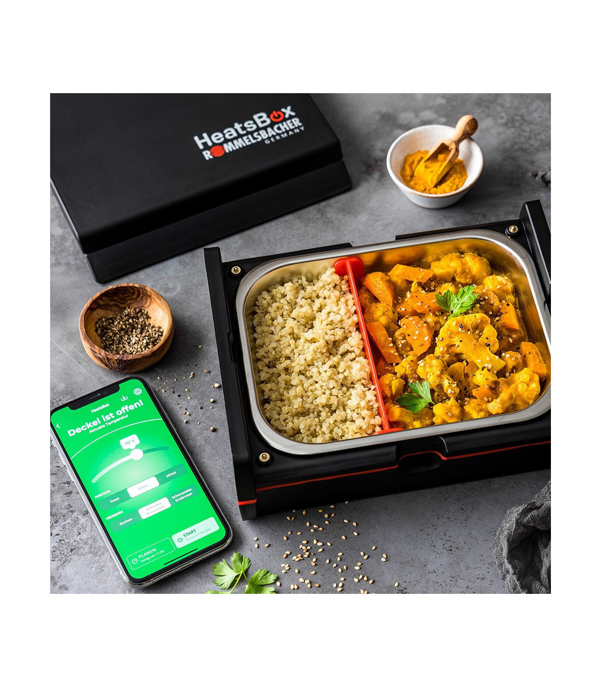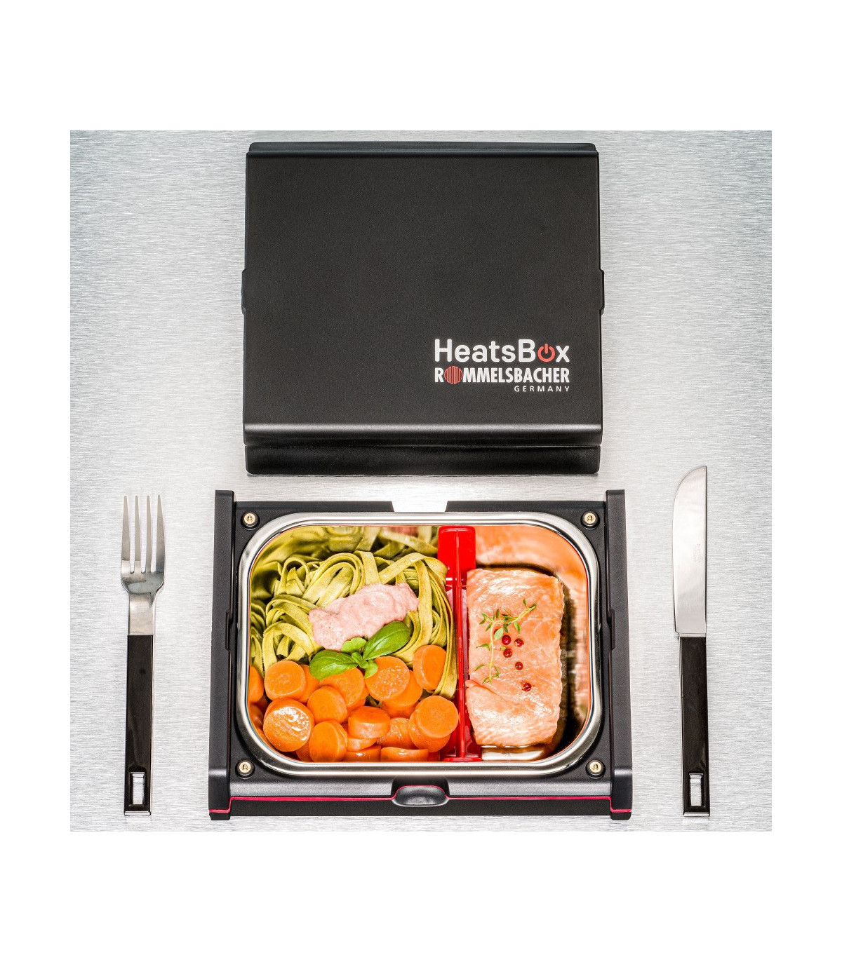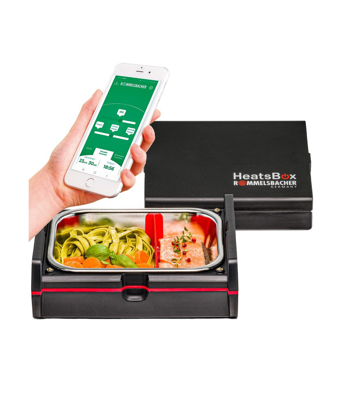 Elektrooniliselt juhitav lõunakarp võimaldab sooja toitu nautida ka mikrolaineahjust ja pliidist eemal. Heatsbox®-i saab mugavalt juhtida nutirakenduse kaudu või ka käsitsi, et teie toit oleks sobival ajal valmis. Kaks tõhusat paneelsoojendit pakuvad õrna kuumust ülevalt ja alt, võimaldades isegi tundlikke toiduaineid väga õrnalt ja ühtlaselt soojendada. Rakenduses saab valida serveerimissuurust, temperatuurivahemikku ja algusaega. Hügieenilisel roostevabast terasest nõul on eemaldatav ruumijagaja.