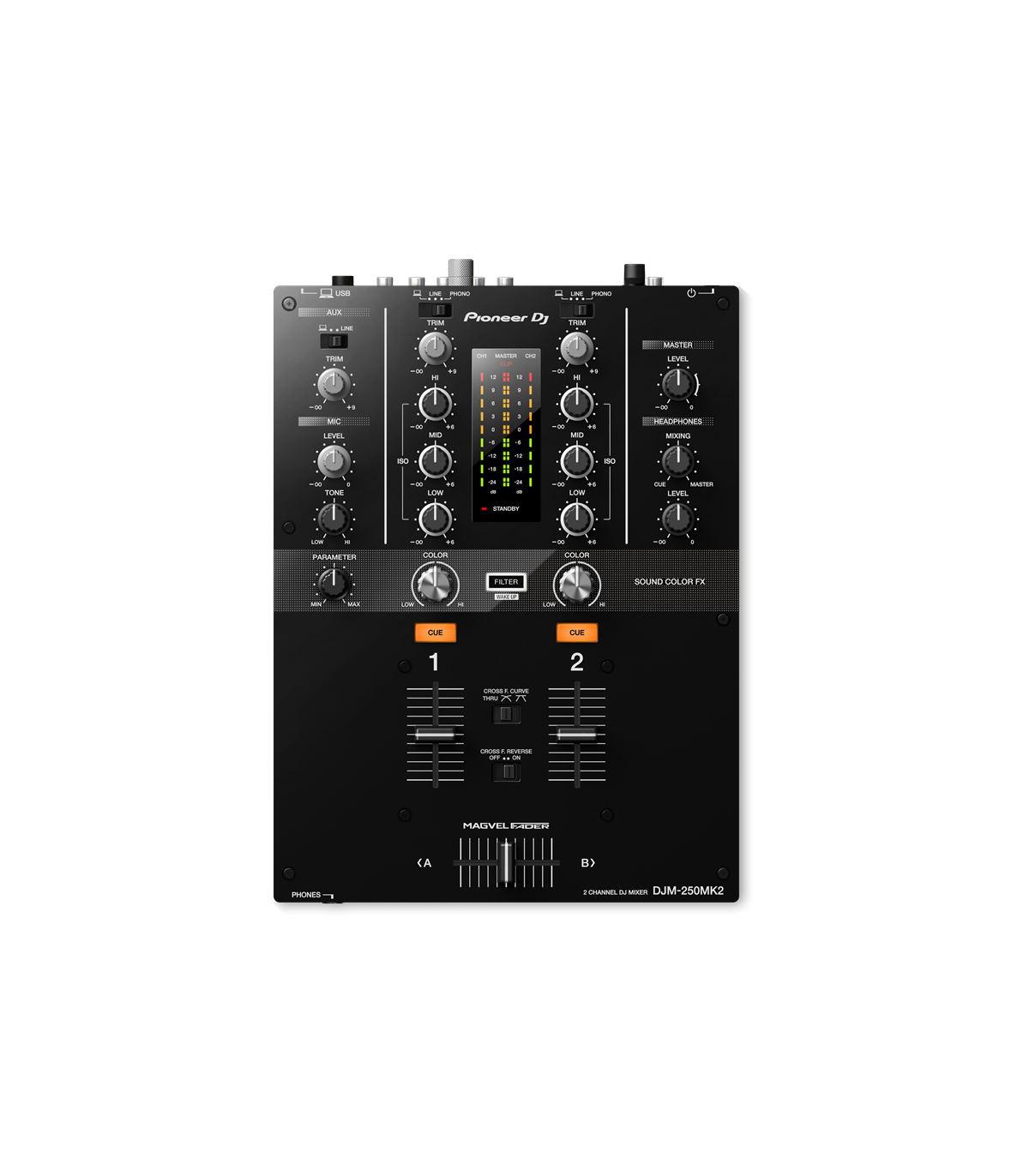 DJM-250MK2 on pärinud mõned populaarse DJM-900NXS2 professionaalsed funktsioonid, näiteks Magvel crossfader ja Sound Color FX filter. Sirgjoonelised juhtimisseadmed, selge paigutus ja spetsiaalsed 3-bandilised eraldajad võimaldavad teil instinktiivselt kriimustada ja miksida.