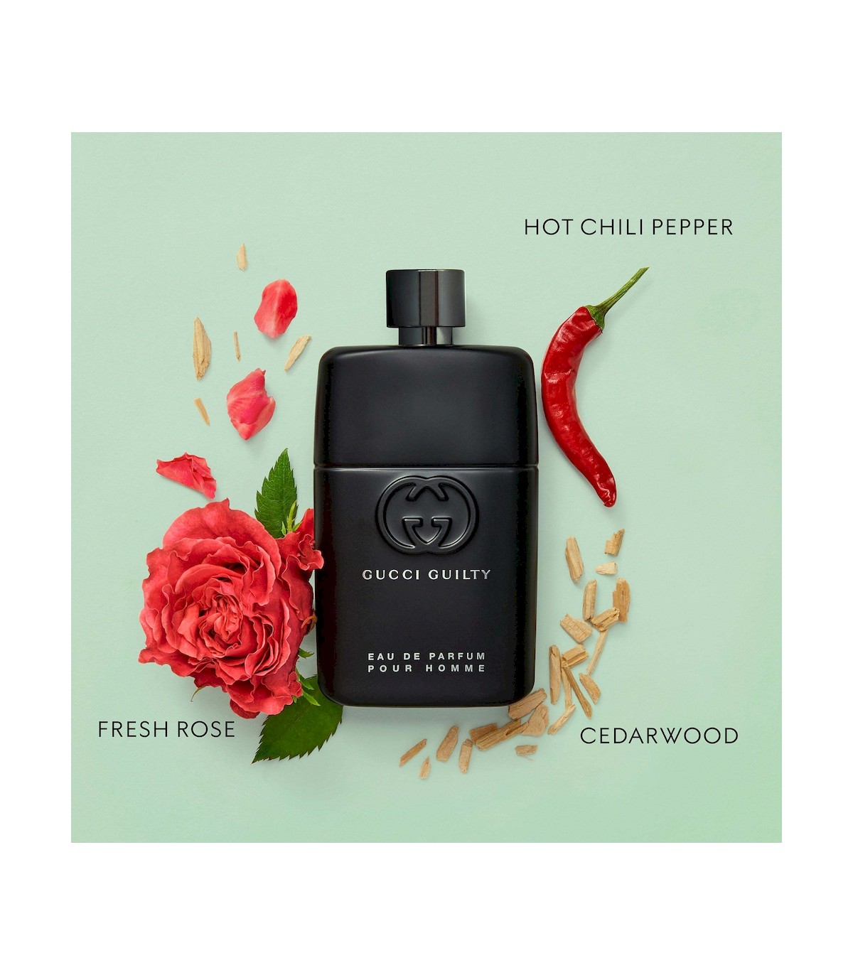 Gucci Guilty Pour Homme salapärane ja ebaharilik parfüüm meestele, mis on loodud eklektilisele ja julgele mehele. Puidu-aromaatne-vürtsikas aroom on loodud provotseerima. Roos ja tšillipipar pakuvad uudset ja kaasaegset lähenemist kahele 70ndatel aastatel suurt populaarsust omanud ikoonilisele parfüümikomponendile ning vahetavad välja originaalparfüümi tipunootidena säranud roseepipra ja itaalia sidruni, luues seeläbi ootamatu ja karastava retrovaibi. Punase pipra soojale vürtsikusele vastandub kirbelt aromaatne värskus ning äädika ja soola aimdusest hoovab ootamatuid aistinguid. Veelgi suuremat intensiivsust lisades kujundavad apelsiniõite absoluut, neroli ja prantsuse lavendel parfüümi südame tugevaks ja veelgi mehelikumaks avalduseks. Lõhna põhjas rõhutavad lopsakust ja sensuaalsust patšuli ja seedripuit.