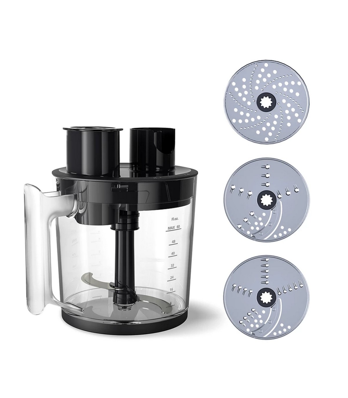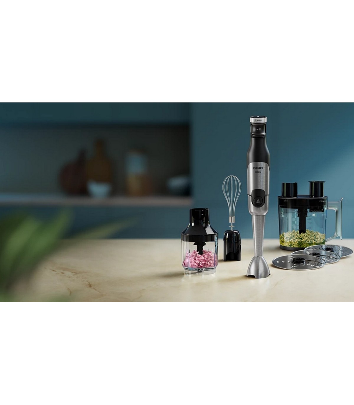 * SpeedTouchi tehnoloogia - vastavalt vajutuse tugevusele mikseri töökiirus Komplektis - 1,7-liitrine köögikombaini anum koos lõikuri ja kolme kettaga (viilutamine, riivimine, granuleerimine ( kartulipuder)) - Vispel vahukoore, majoneesi ja muude ainete töötlemiseks - Kompaktne hakkija maitsetaimede, pähklite, liha ja palju muu jaoks - mõõtetops 500 ml