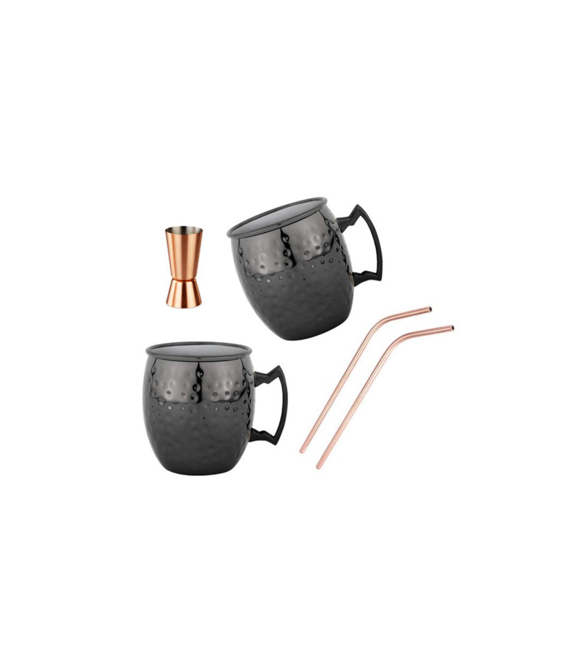 Komplekt sisaldab: 2 roostevabast terasest tassi mahutavusega 550 ml ja 2 vaskkattega roostevabast terasest mõõdutopsi.