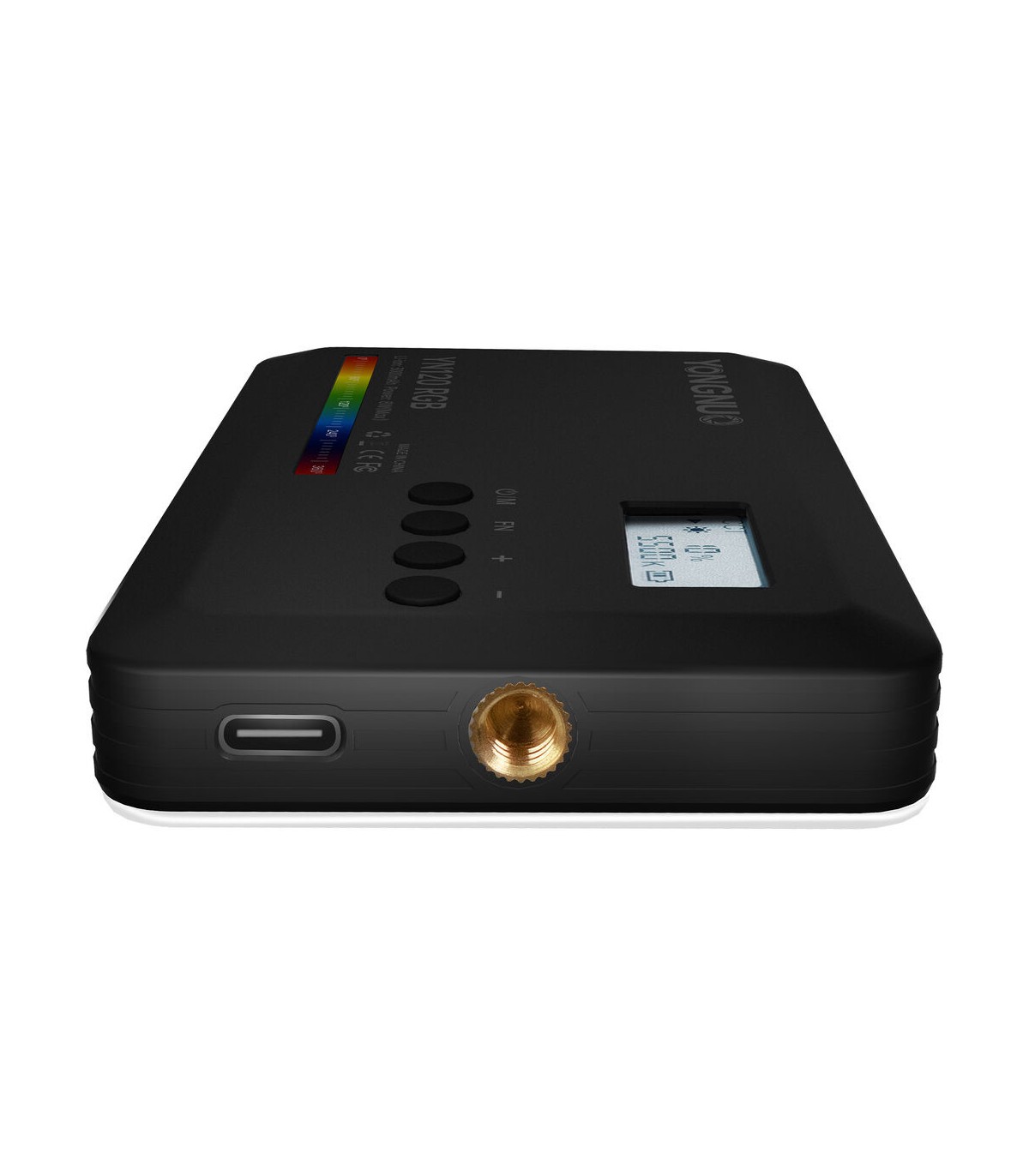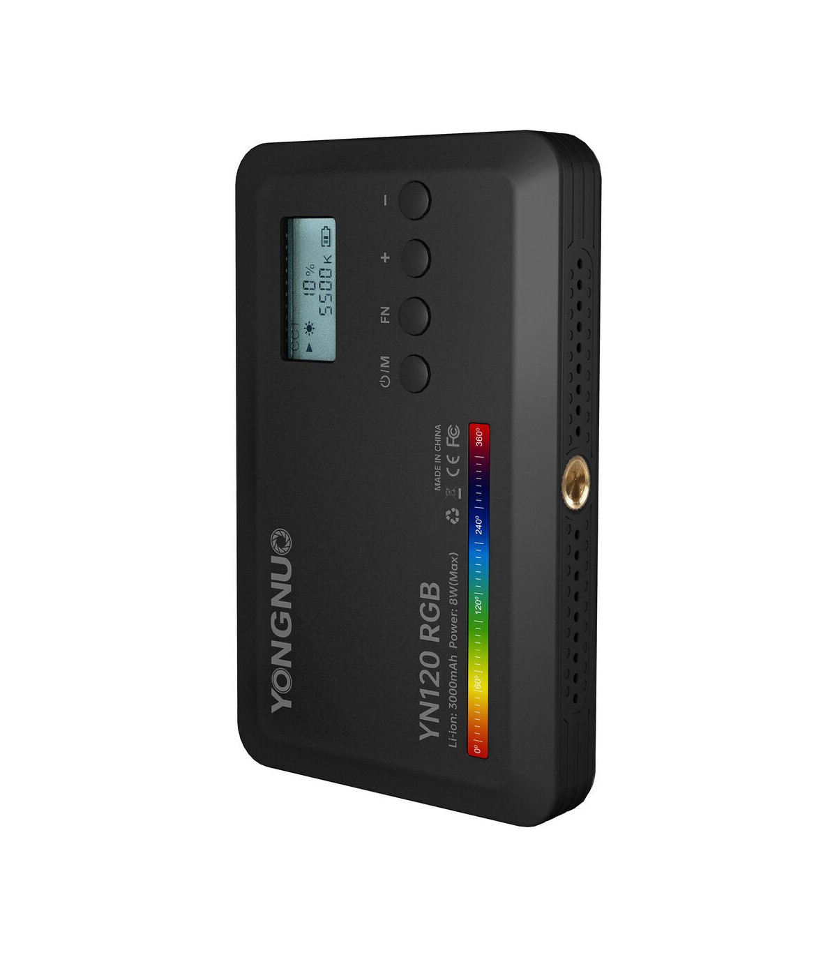 Yongnuo YN120 RGB on varustatud kahe 1/4" keermega, mis võimaldavad valgustit hõlpsalt statiivile kinnitada nii vertikaalselt kui ka horisontaalselt. Komplektis on ka cold shoe adapter, mis võimaldab valgustit kaamera peale paigaldada.