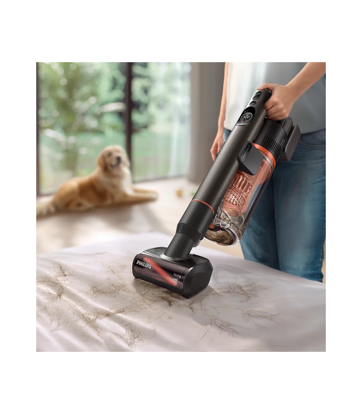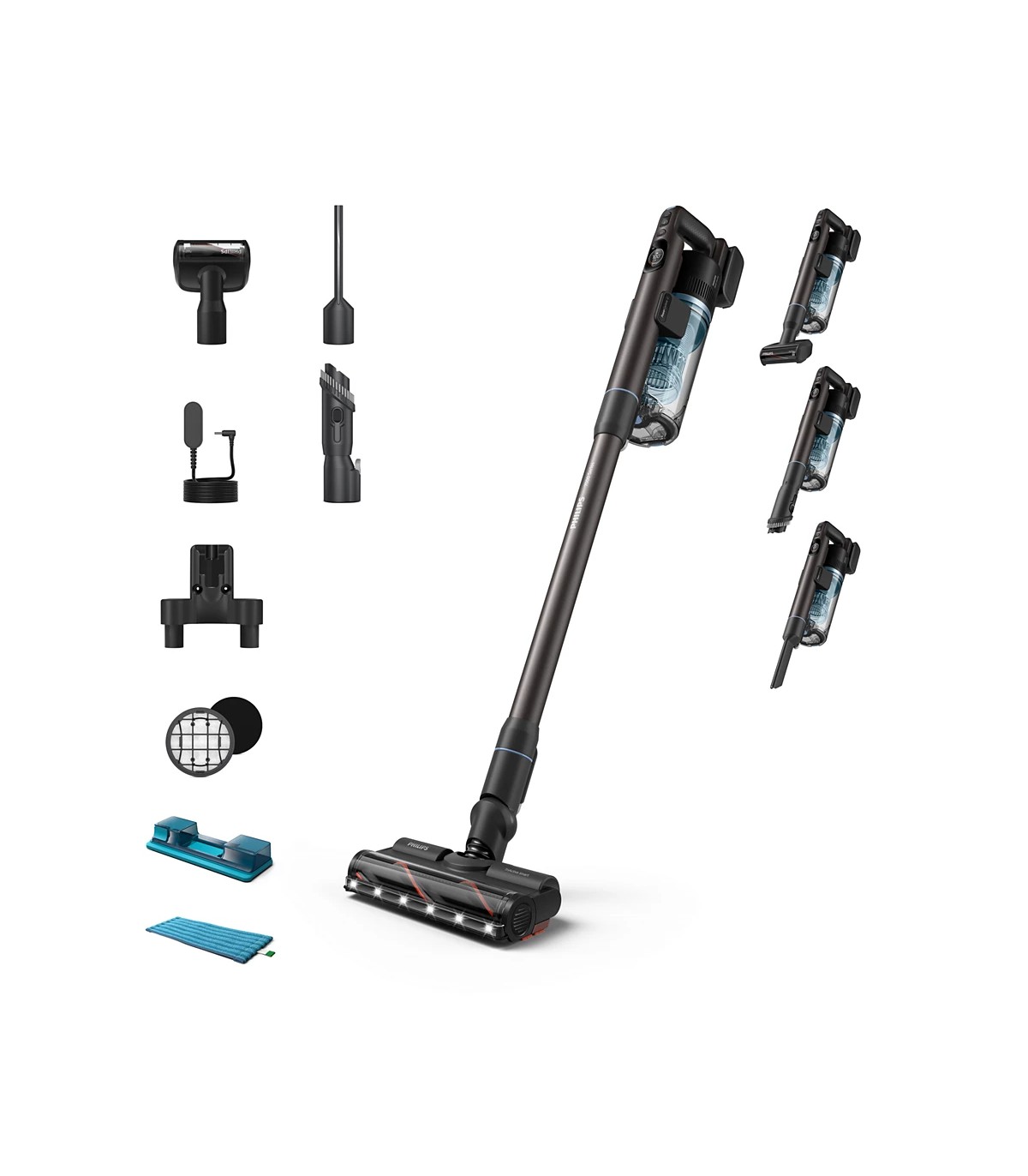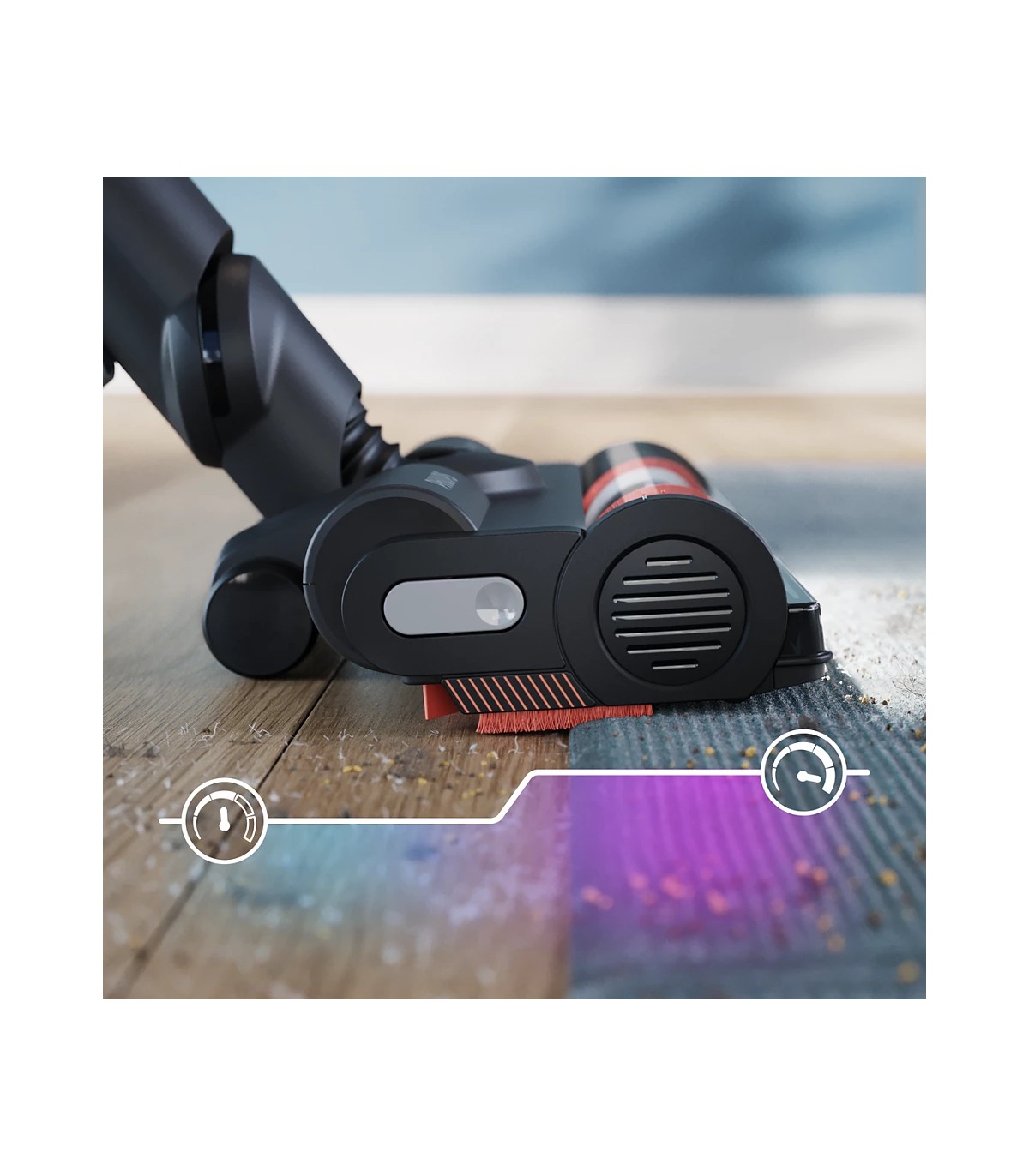 * Nutikas, valgustatud PrecisionPower otsak eemaldab ühe liigutusega (360°) kuni 99,9% tolmust ja mustusest ning optimeerib nutika põrandatüübi tuvastamise abil automaatselt harja pöörlemiskiirust ja õhuvoolu kõvakattega ja pehmete põrandate peal