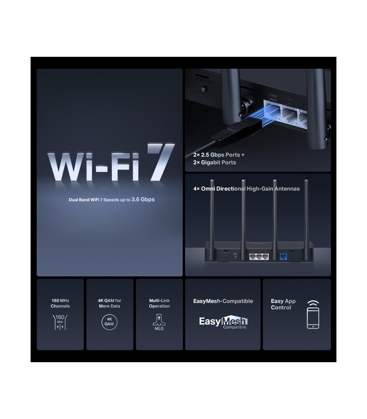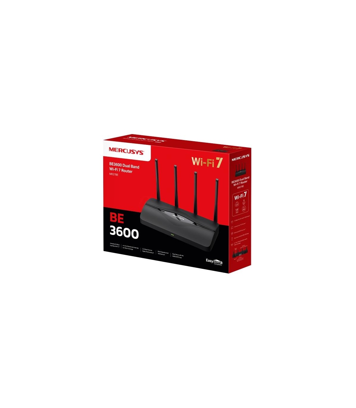 - Mercusys BE3600 Dual Band Wi-Fi 7 Router. WAN connection type: RJ-45. Wi-Fi band: Dual-band (2.4 GHz / 5 GHz), Top Wi-Fi standard: Wi-Fi 7 (802.11be), WLAN data transfer rate (max): 3600 Mbit/s. Ethernet LAN interface type: 2.5 Gigabit Ethernet, Ethernet