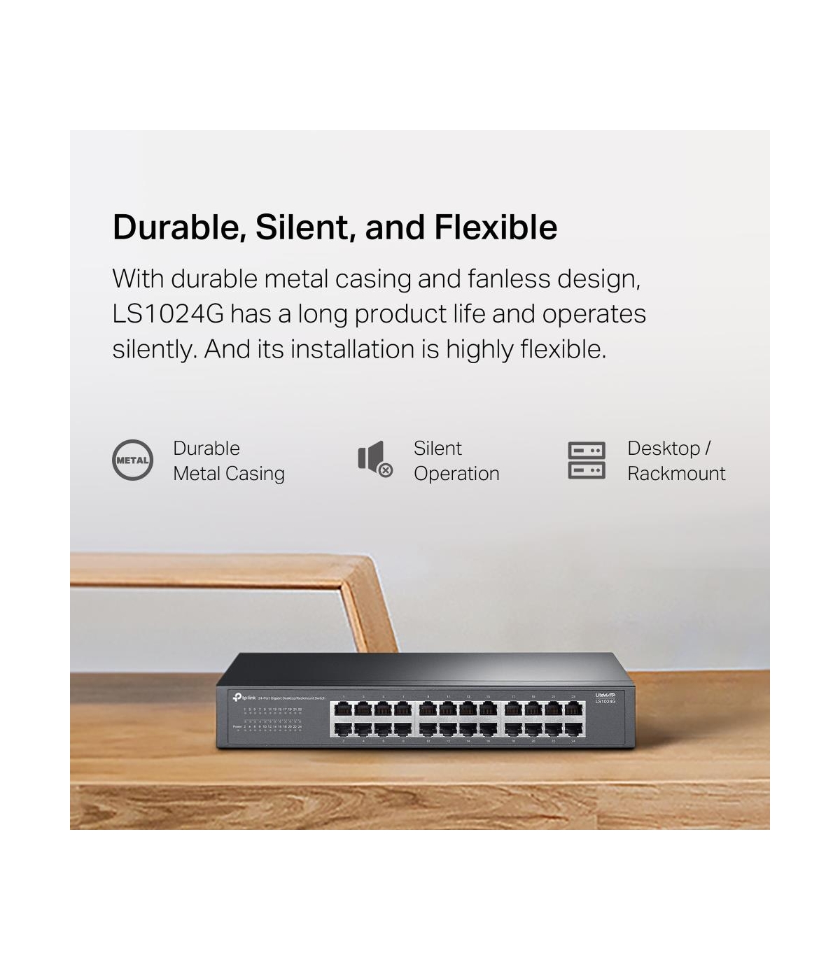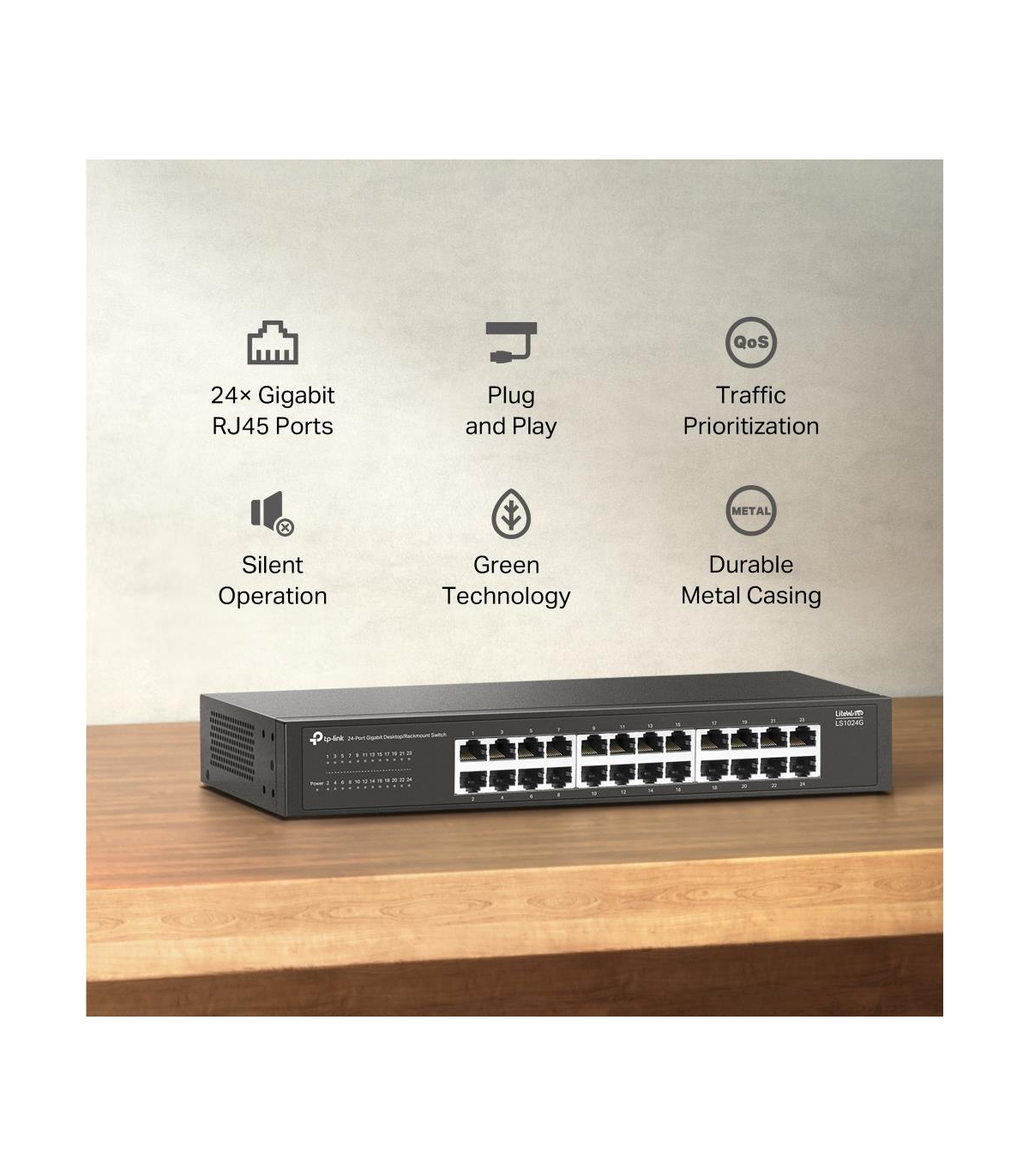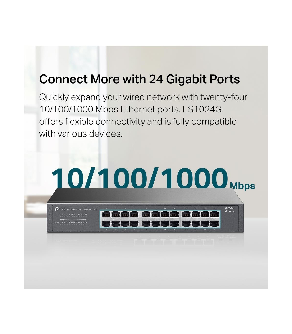 - TP-Link LS1024G. Switch type: Unmanaged. Basic switching RJ-45 Ethernet ports type: Gigabit Ethernet (10/100/1000), Basic switching RJ-45 Ethernet ports quantity: 24. MAC address table: 8000 entries, Switching capacity: 48 Gbit/s. Networking standards: IE