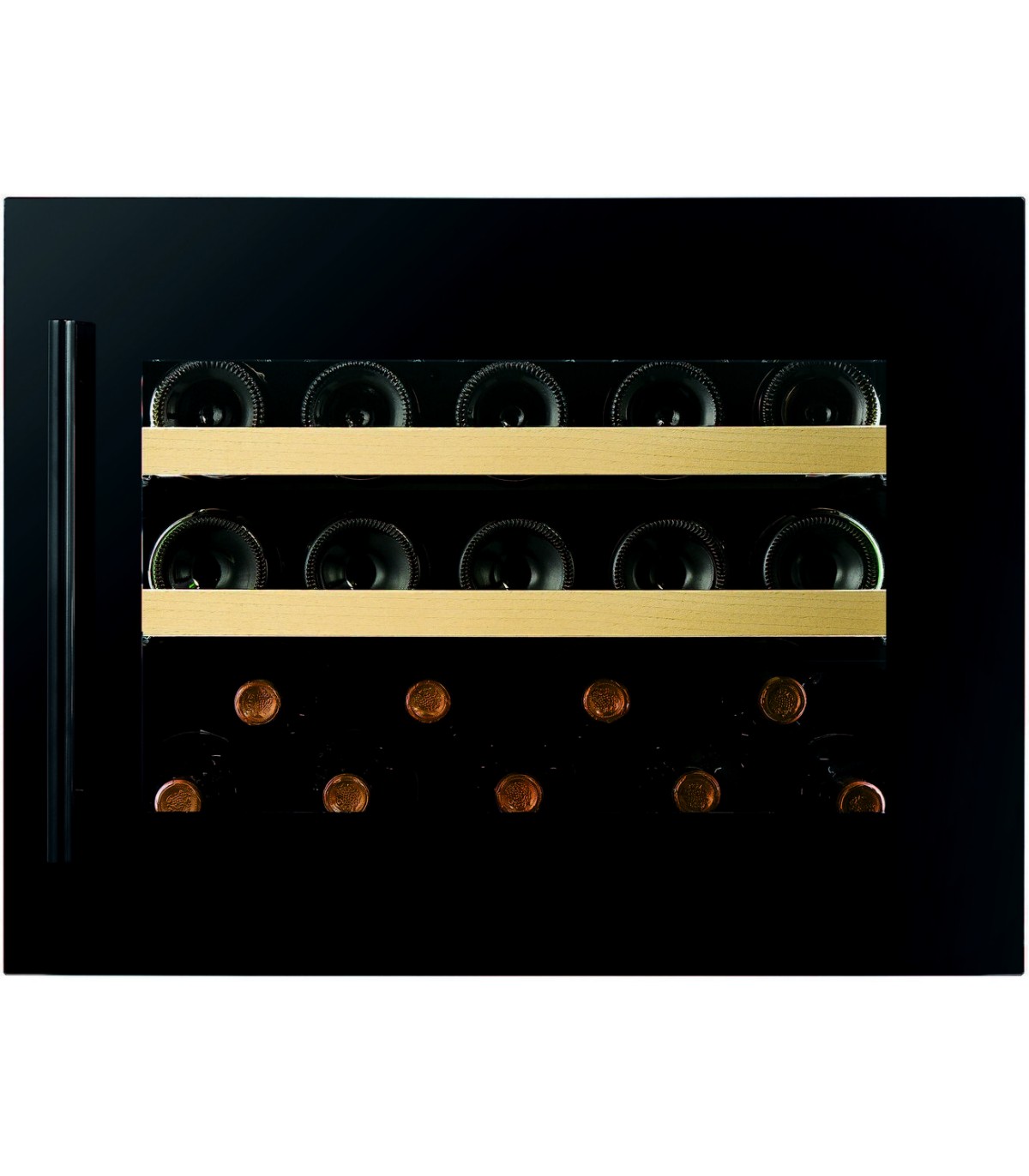 Dunavox Spirit-19 bottle capacity integrated model with black handle opening. Elevate your wine experience with our exclusive fully integrated LCD screen wine cooler. Combining cutting-edge technology with sleek, modern design, this wine cooler is the epitome of luxury and convenience for any wine enthusiast.Integrated Design: Crafted to blend perfectly with your kitchen or bar decor, this wine cooler fits seamlessly into any space. Its sleek, minimalist design enhances the aesthetic appeal of your home.Integrated ventilation system: Simple to install without a plinth vent; allowing integrated coolers to be installed undercounter, maintaining the lines of the kitchen.Optimal Wine Preservation: Maintain your wines at the perfect temperature with dual-zone cooling technology. Our wine cooler ensures each bottle is stored in ideal conditions, preserving the flavor and quality of your collection.WiFi Connectivity: Monitor and control your wine cooler from anywhere with our WiFi option. Adjust temperature settings, receive alerts, and keep track of your collection through a dedicated app on your smartphone or tablet.Energy Efficient: Designed with eco-friendly technology, our wine cooler offers high performance with low energy consumption, reducing your carbon footprint without compromising on quality.