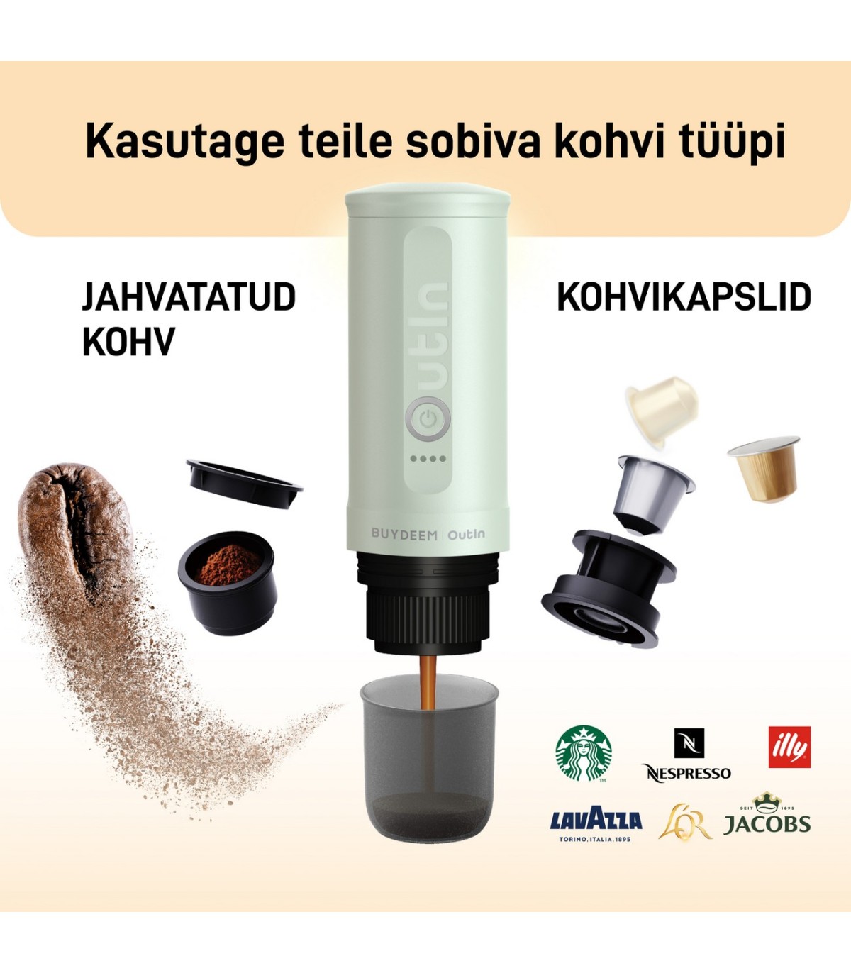 * Võimalus kasutada jahvatatud kohvi (oamahuti 6 g) või S - suuruses kohvikapsleid kaubamärkidelt Nespresso, Starbucks, Illy, Lavazza, L'OR, Jacobs