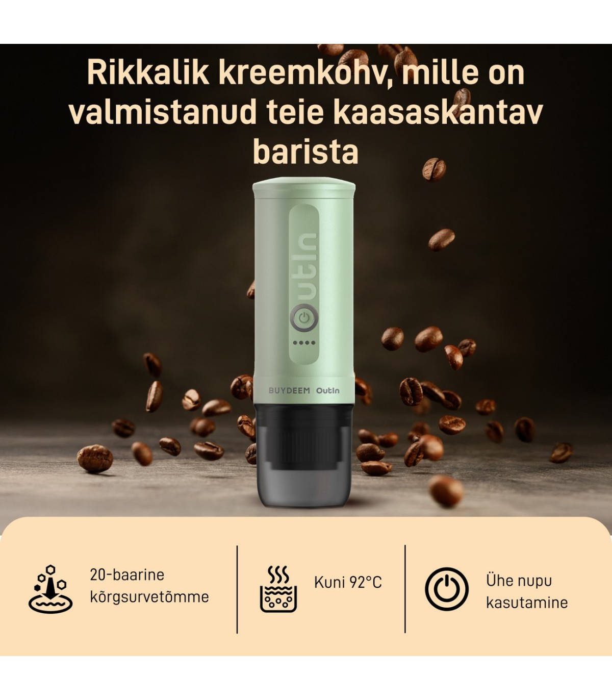 * Kerge, vaid 670 grammi kaaluva disainiga espressomasin mida kõikjale kaasa võtta