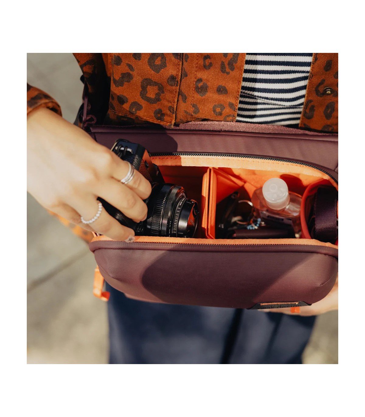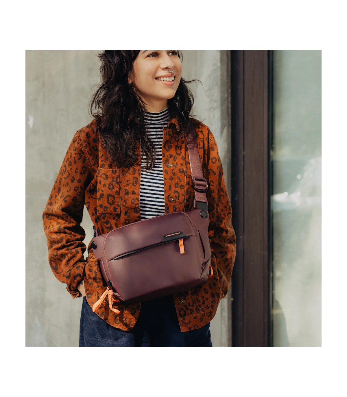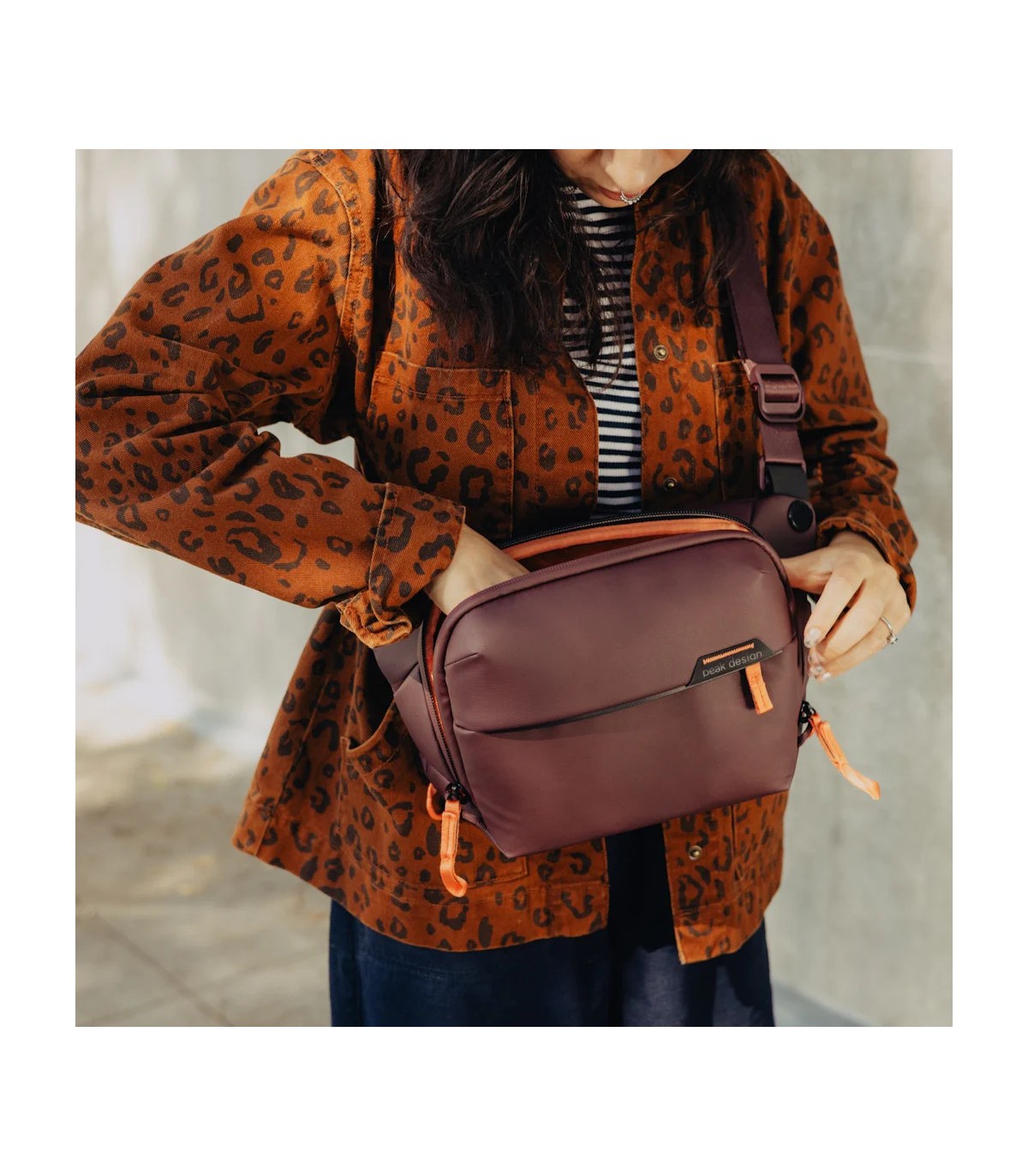 Peak Design Everyday Sling on loodud kohanemisvõimet silmas pidades. Sellel on reguleeritav polsterdatud õlarihm mugavaks käed-vabad kandmiseks, mida saab reguleerida nii vasaku kui ka parema õla jaoks. Lisaks saab turvalisuse ja mugavuse suurendamiseks kanda ümber rinna või vöökoha stabiliseerivat rihma.