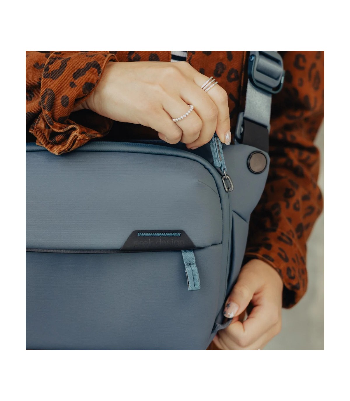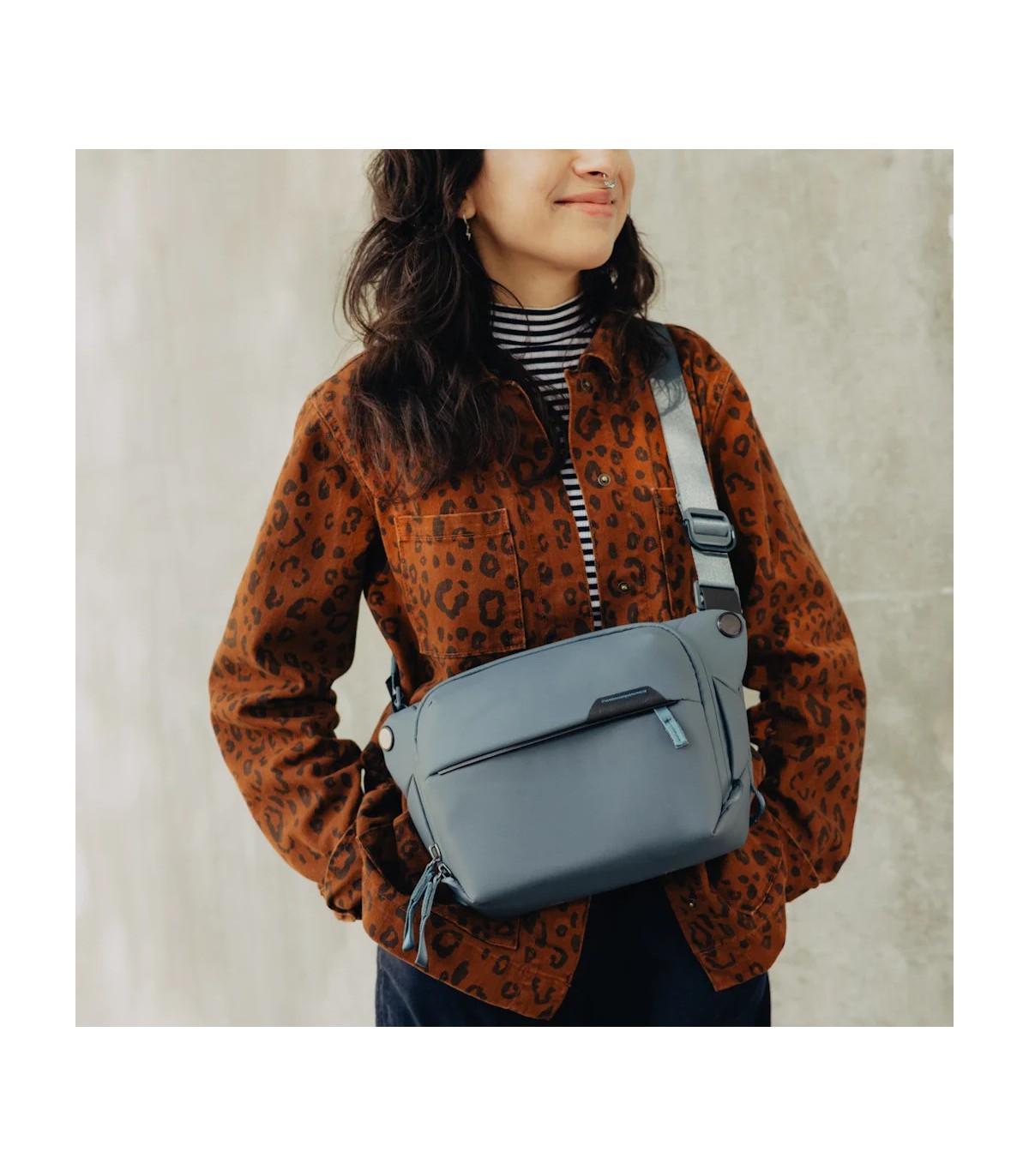 Peak Design Everyday Sling on loodud kohanemisvõimet silmas pidades. Sellel on reguleeritav polsterdatud õlarihm mugavaks käed-vabad kandmiseks, mida saab reguleerida nii vasaku kui ka parema õla jaoks. Lisaks saab turvalisuse ja mugavuse suurendamiseks kanda ümber rinna või vöökoha stabiliseerivat rihma.