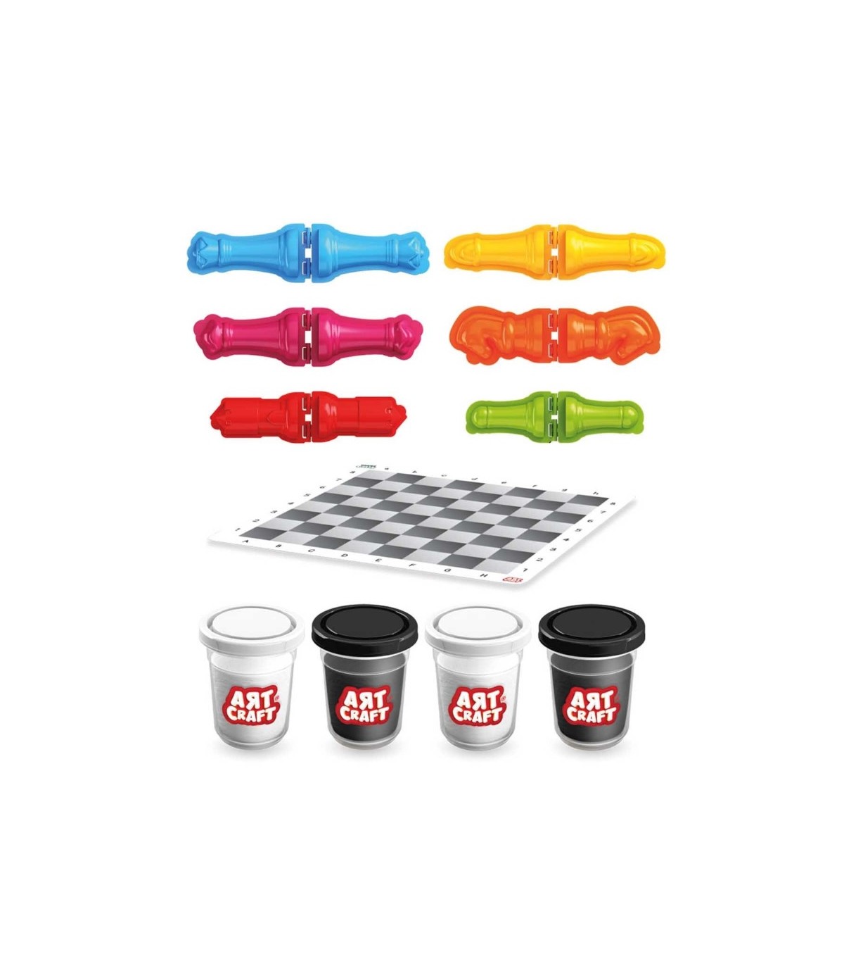 Komplektis on malelaud, 4 x 100 g voolimismassi ning vormid malendite jaoks.